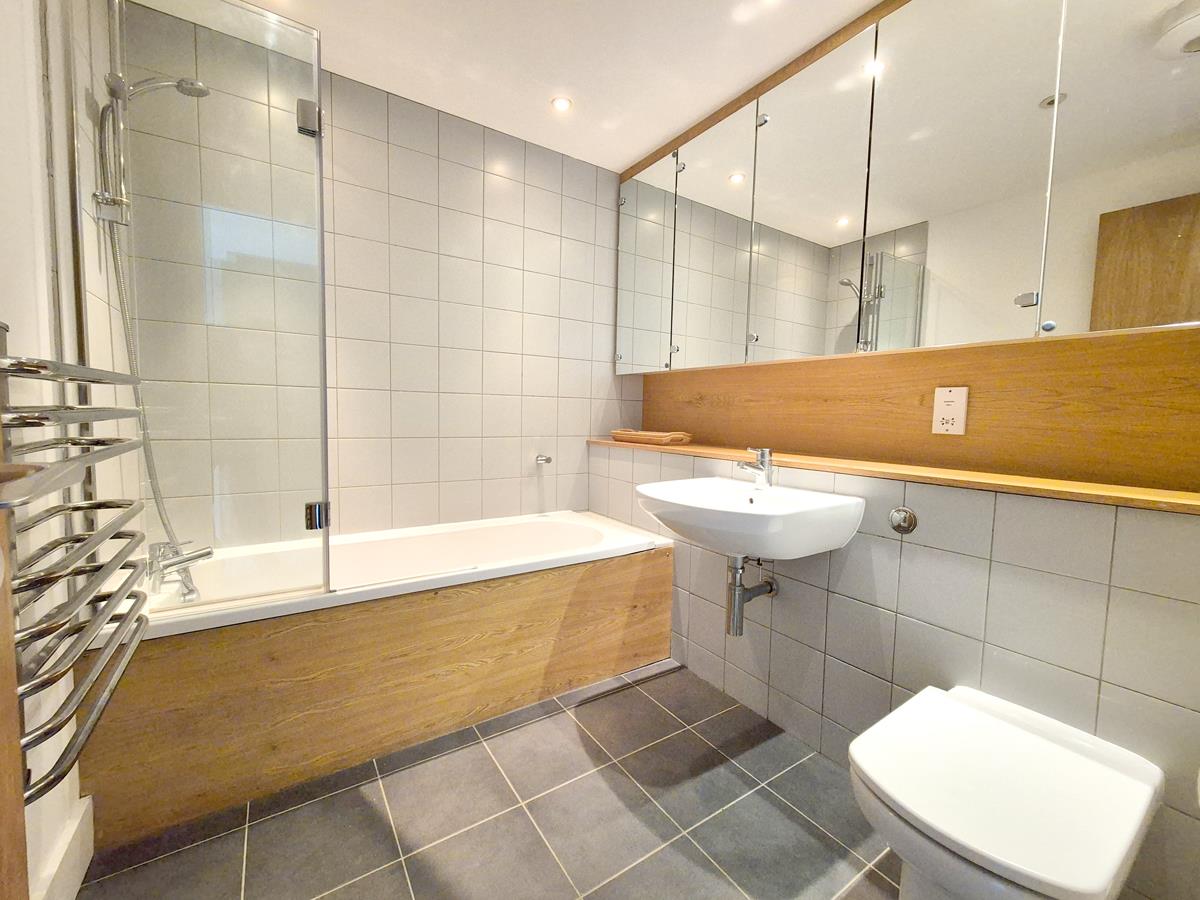 An en suite bathroom comprising of a bath with mixer tap and shower attachment over, wall mounted wash basin with mixer tap over and a W.C. with concealed cistern. There is a tiled floor, partially tiled walls, heated towel rail and built-in mirrored bathroom units.