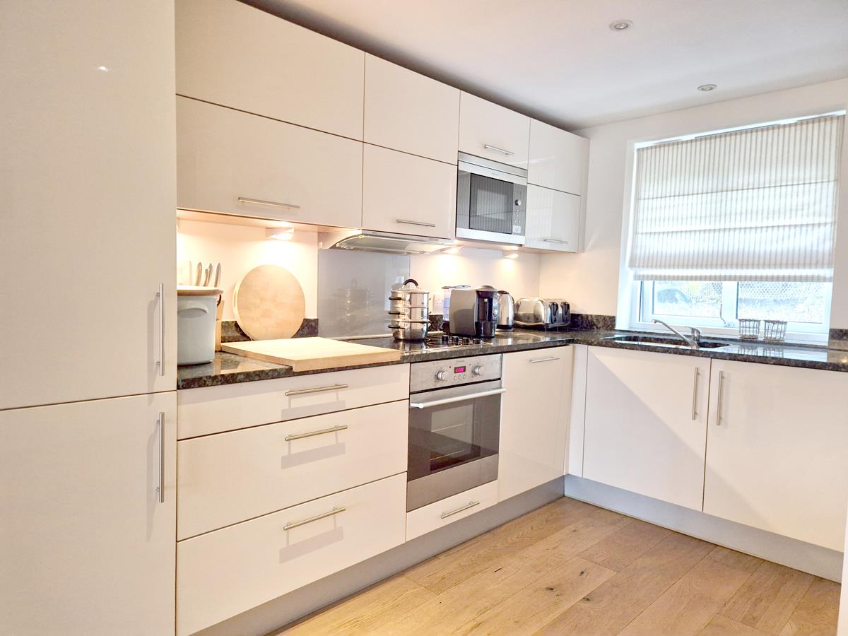 Comprising an attractive kitchen with stone working top surfaces incorporating a one and a half bowl inset sink unit with mixer tap over, cupboards and drawers under and wall cupboards over. An array of built-in appliances including an oven with hob and hood over, microwave, dishwasher and fridge/freezer.