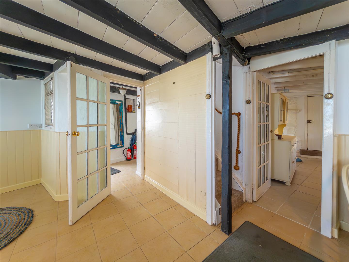 With a tiled floor, three windows to the front overlooking the sea, a log burner, beamed ceiling, stairs to the first floor and a glazed door to the kitchen.