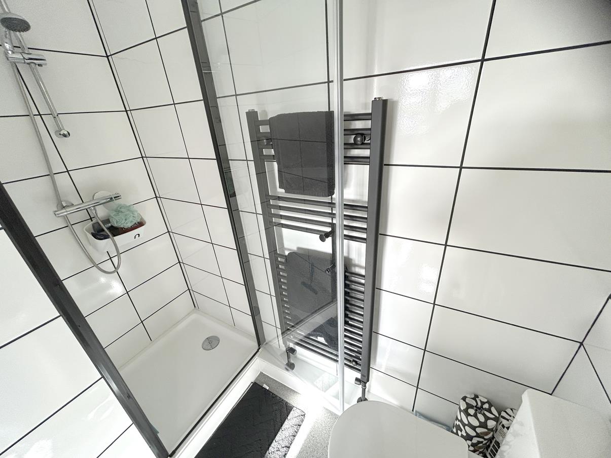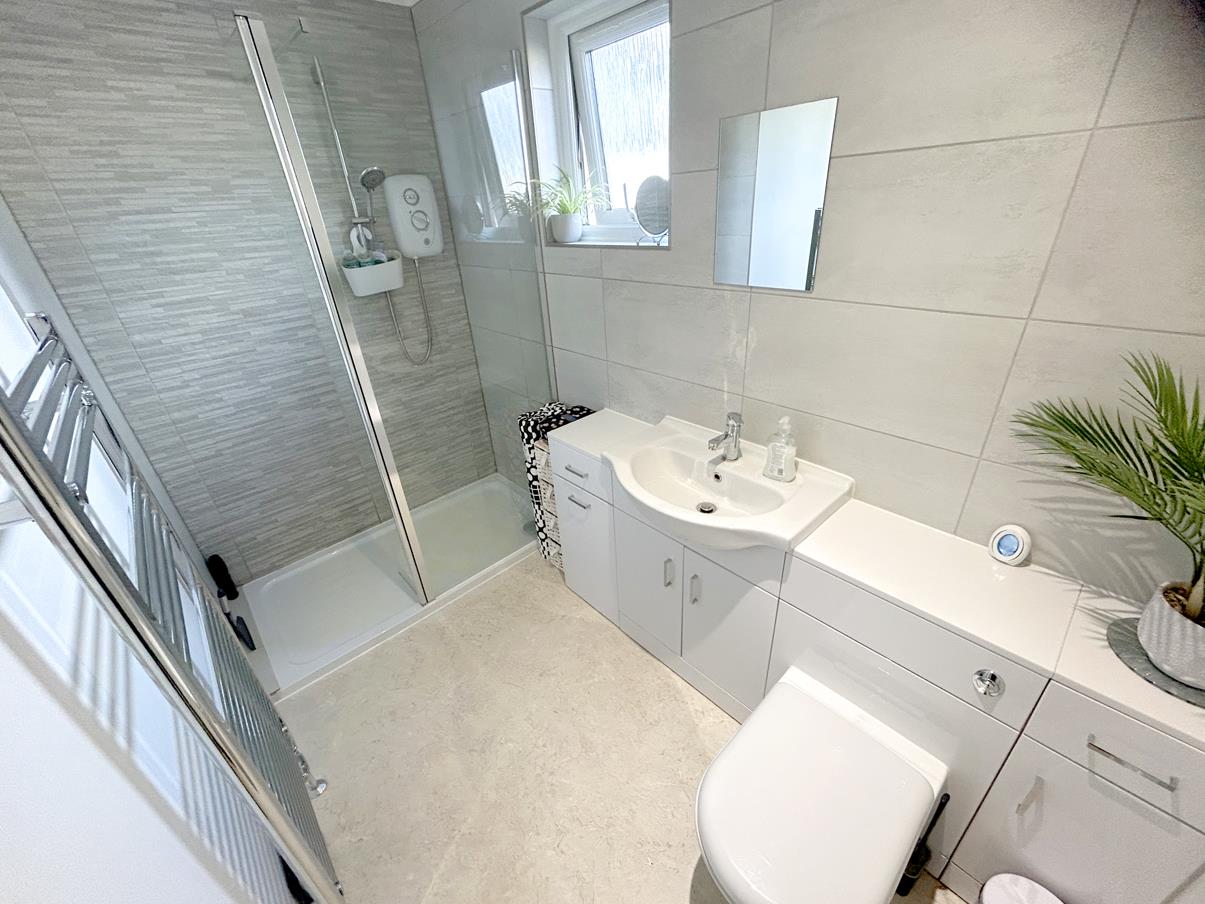 With a white fitted suite with a low-level w.c, pedestal wash hand basin with mixer tap over and a shower cubicle housing a thermostatic shower. There is a ladder style towel rail, an extractor, vinyl flooring, shaving point, attractive white tiling to the walls and an obscure glazed window to the side aspect.