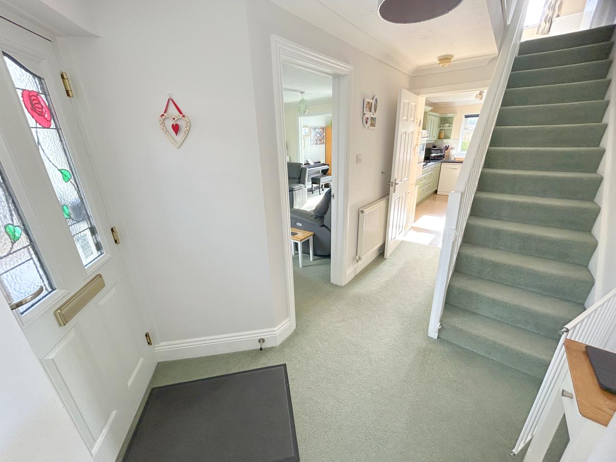 Generously sized with opening to staircase, door to understairs storage cupboard and door to further cupboard with coat hanging rail and shelf over. Doors to lounge/dining room, kitchen and door to