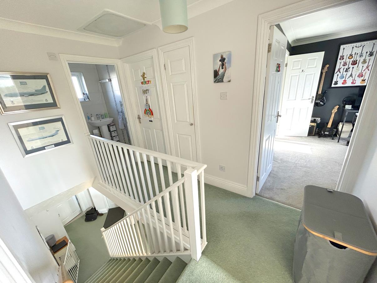 With white wooden balustrade, door to airing cupboard with shelving, loft hatch to roof space and doors off to all four bedrooms and the family bathroom.