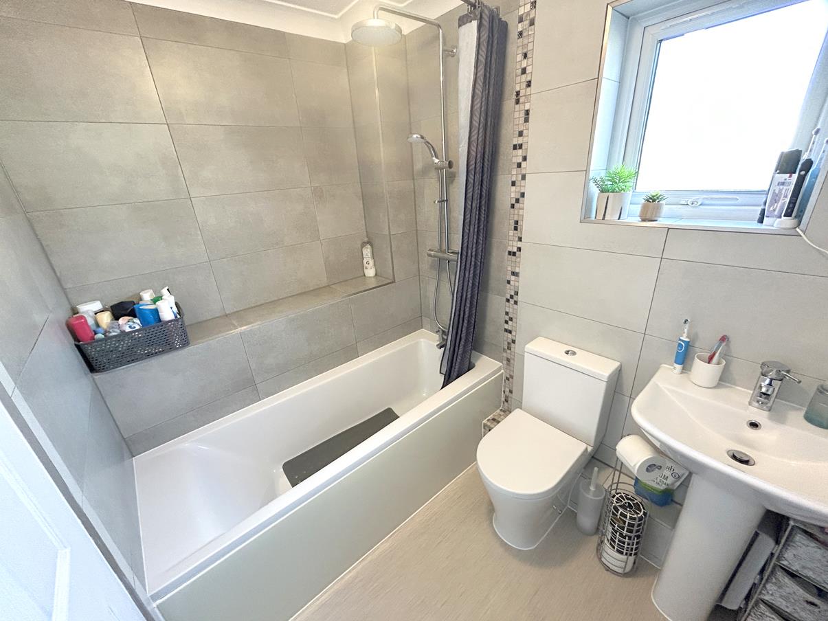 Comprising a white suite with low-level w.c, pedestal wash hand basin with mixer tap over and a white panelled bath with a tiled surround and bespoke shelf, housing a thermostatic shower with attachment and rainforest style drencher head. The room is complimented by attractive tiling to the walls, a chrome ladder style towel rail, vinyl flooring, a shaving point / light and an obscure glazed window to the front.