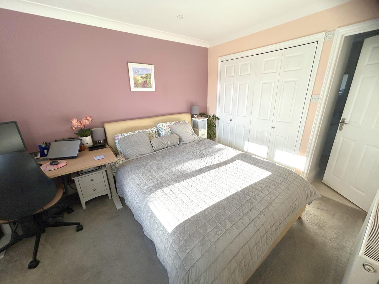 Comfortable double bedroom with built-in wardrobes with sliding doors and hanging rail with storage over, window to rear aspect, recessed spotlighting and