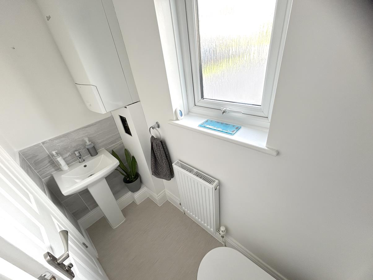 Having a white low-level w.c, pedestal wash hand basin with tiled surround, electric consumer unit, a wall mounted Worcester gas fired boiler, vinyl flooring and an obscure glazed window to the front.