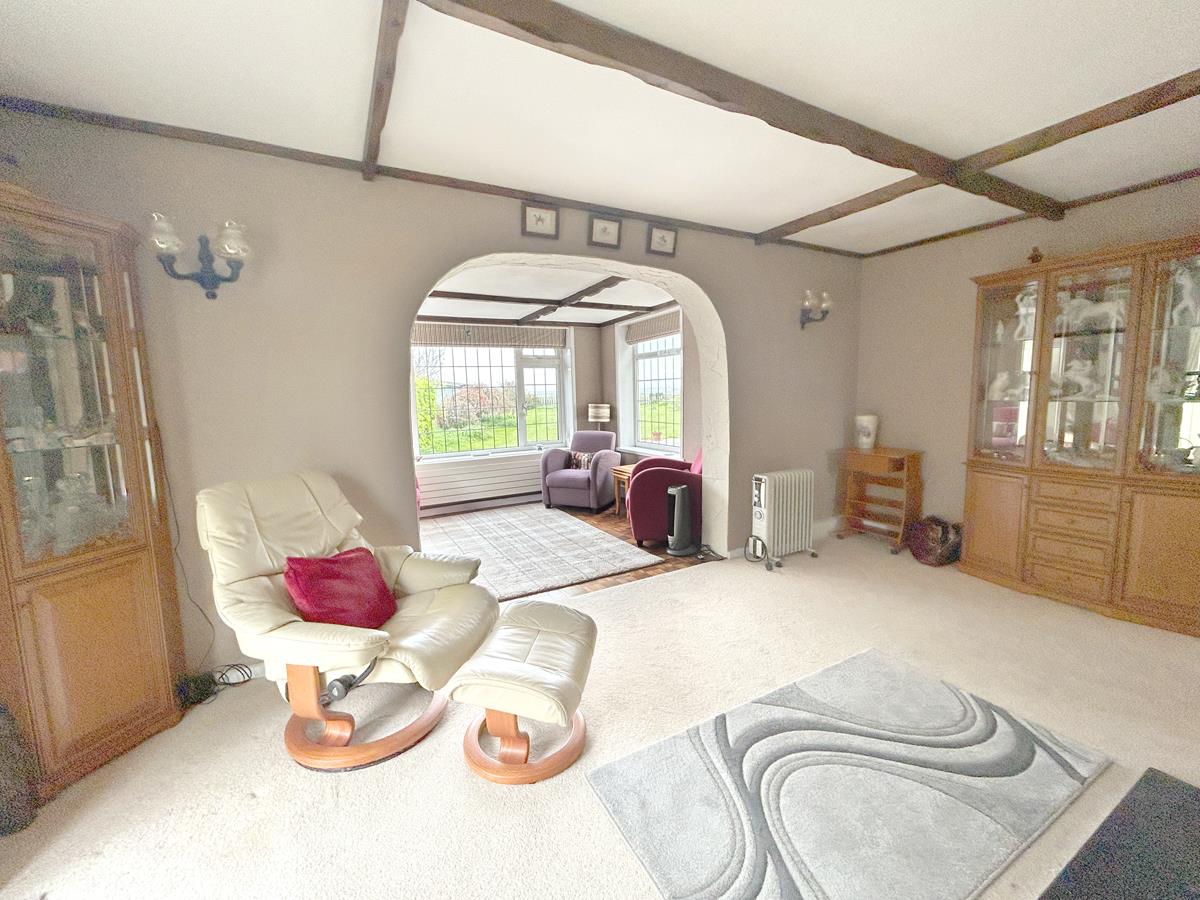 With beam effect ceiling and a fireplace housing a wood burner (not tested), the area is illuminated by wall lights and a glazed door with matching side panel leads out onto the side access with archway through to