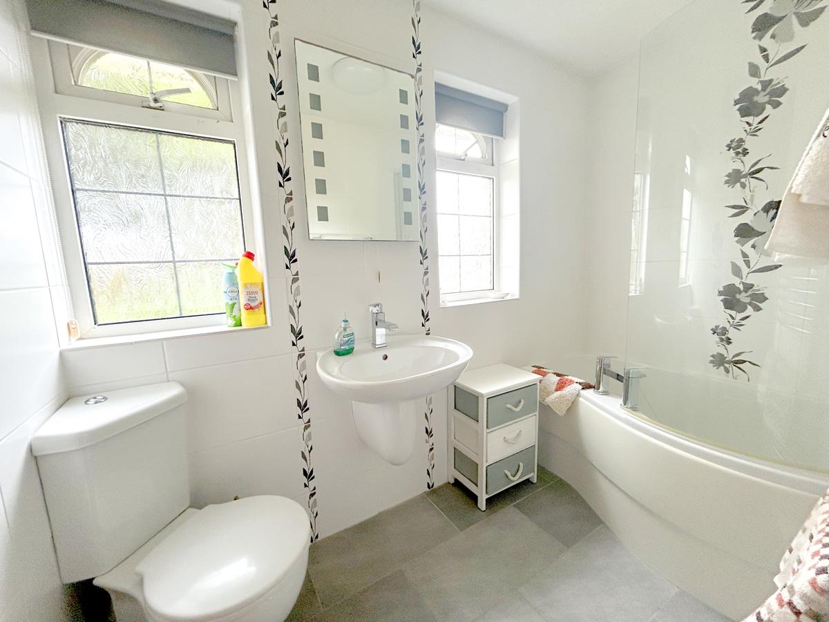 The bathroom is fitted with a P-shaped bath with shower over and tiled splashback, a wall mounted wash hand basin with illuminated mirror above, and a dual flush W.C. Attractive tiling extends to both the walls and floor, while two obscure glazed windows to the front aspect provide natural light. A chrome ladder style heated towel rail completes the space.