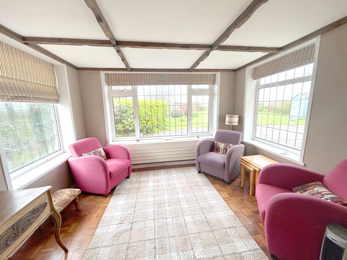 A lovely space again with beam ceiling being triple aspect with views out over the garden and rural views over rolling countryside. The room has parquet style flooring and is illuminated by wall lights.