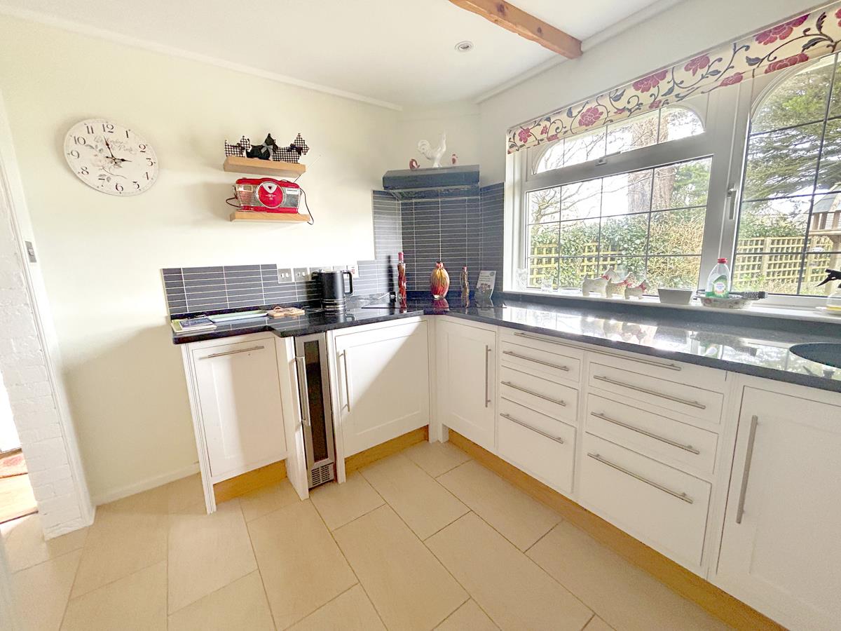 Integrated appliances include a refrigerator, Neff tilt and slide oven, slimline dishwasher and wine cooler. The room is enhanced by charming beam effect ceilings and part wood panelled walls, with a window to the front aspect overlooking the garden. A series of downlighters provide illumination, and the space is finished with practical tile effect flooring.