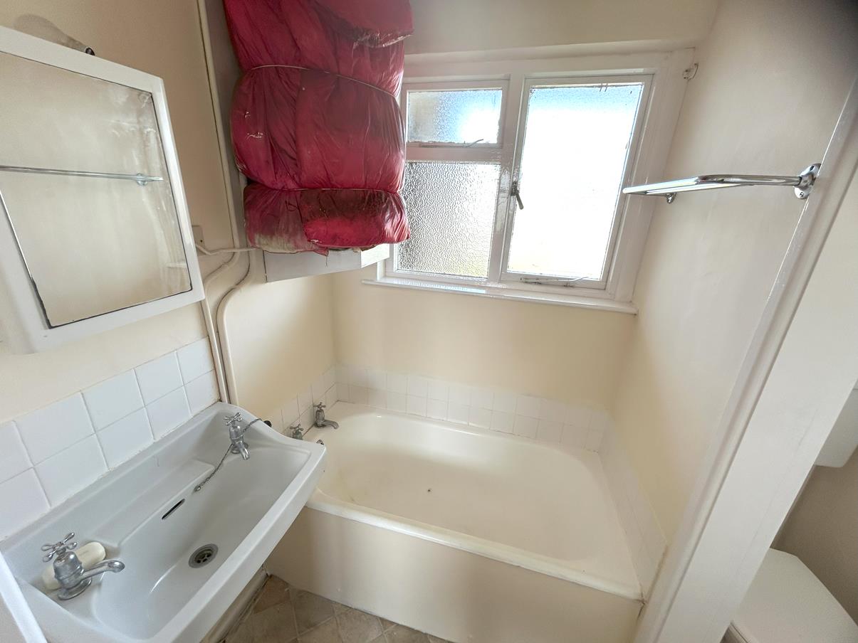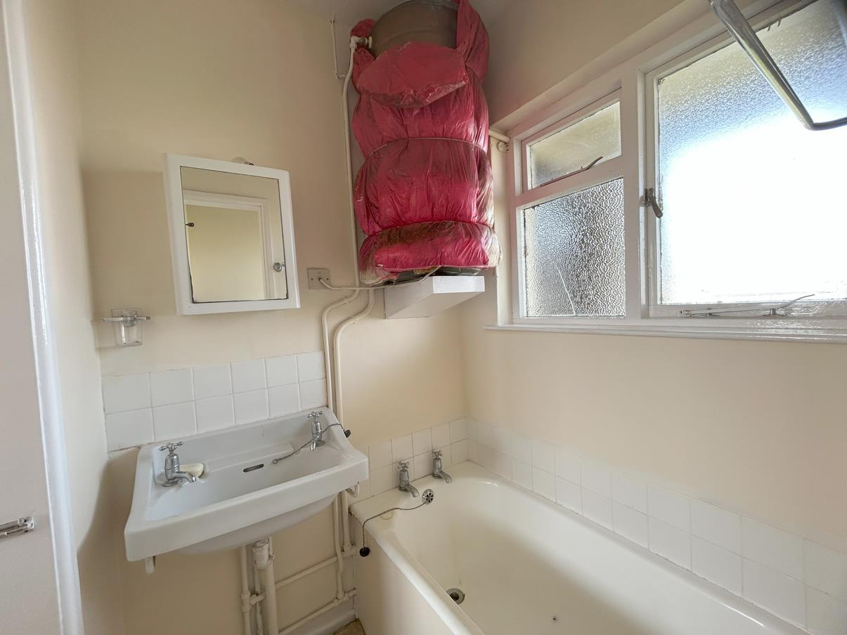 With vinyl flooring with a wash handbasin with tiled splashback, mirrored medicine cabinet and a panelled bath with a shelf housing the hot water cylinder. Obscure glazed window to front aspect