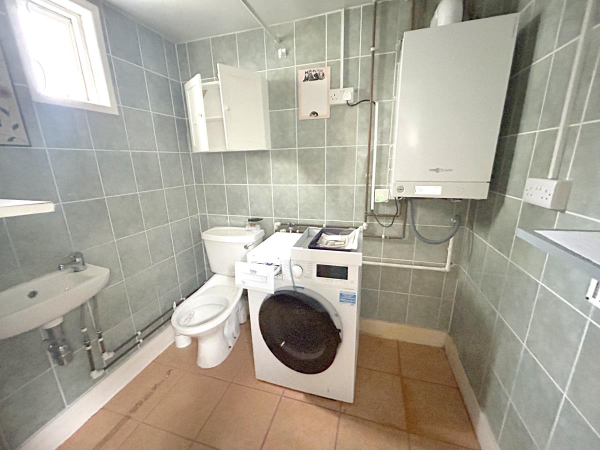 A useful space with close coupled W.C., wall mounted wash hand basin, plumbing for washing machine, shelving, gas boiler, window to the side aspect, tiling to the walls and floor.