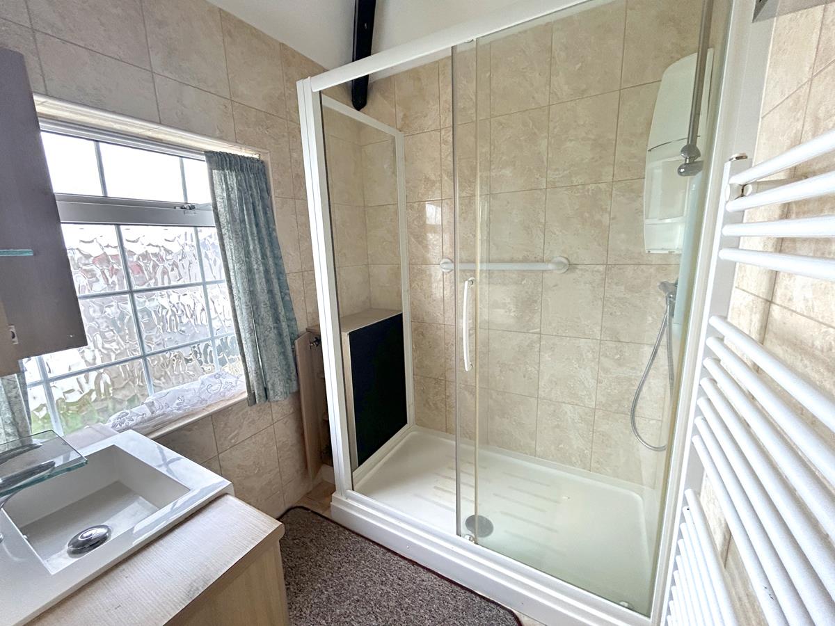 This L-Shaped room has a glazed and tiled walk-in shower cubicle, wash hand basin set into a vanity unit with storage under, further storage and mirror over with light, ladder style drying radiator and tile effect flooring. Storage cupboard with shelves and tiling to the walls.