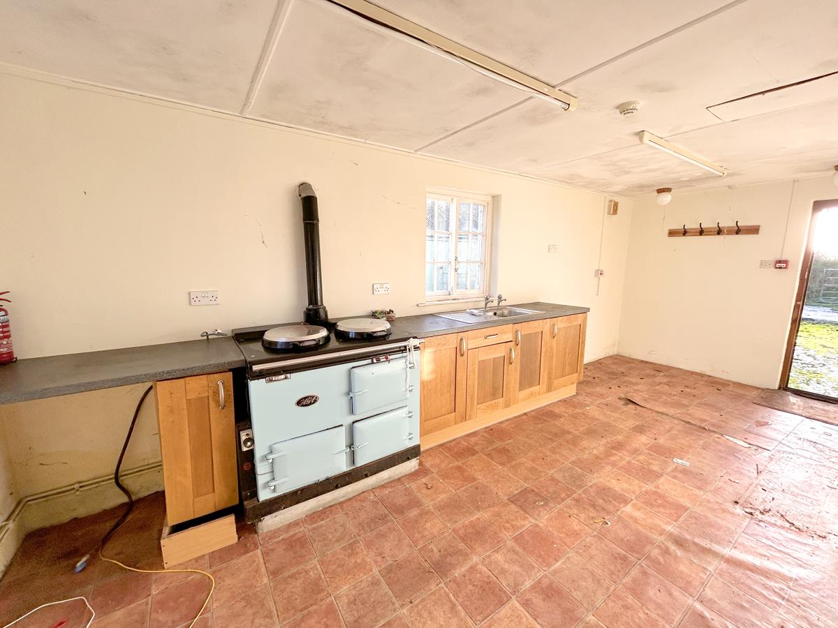 A wood effect kitchen with stone effect worktop that incorporates a stainless steel sink drainer. There is a pale blue Aga (not tested). The room has windows both to the side and rear aspect and there is a door to the front.