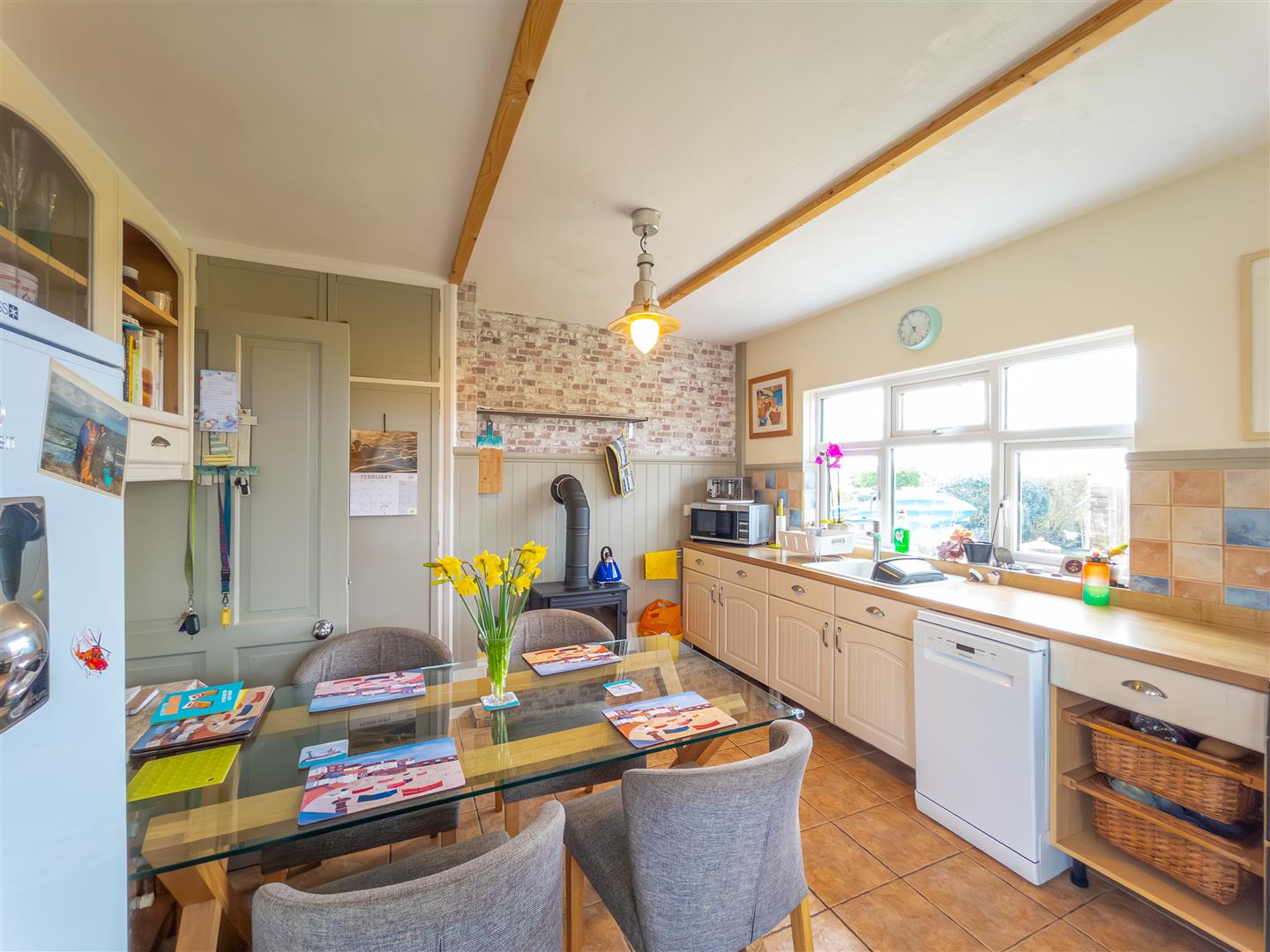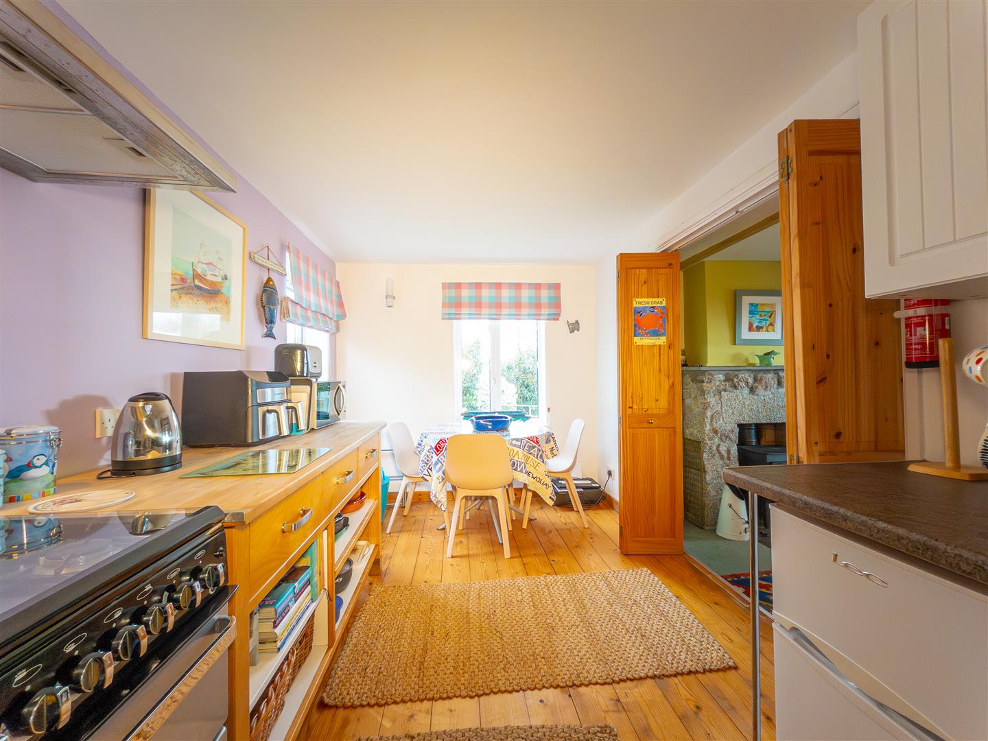 A bright dual aspect room with windows to side and rear fitted with base and wall units with work surfaces over and ceramic sink with mixer tap, space and point for gas oven, free standing butcher block style unit providing for additional storage and work surface space, space and point for under counter fridge freezer.