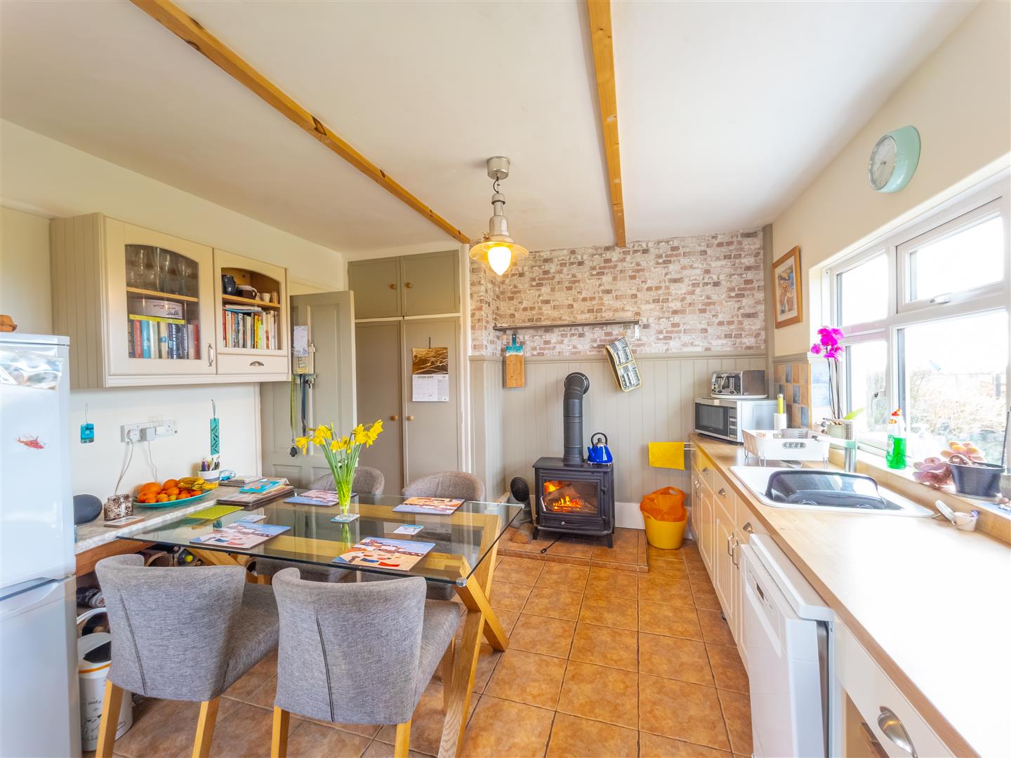 A dual aspect room with tiled floor, fitted with a range of base units with work surfaces over, space and point for fridge/freezer, space and plumbing for slimline dishwasher, Chef Master Level range oven featuring four ovens, five gas burners including a wok burner and a dual electric plate (available by separate negotiation), window to the side overlooking the garden and two windows to rear and door to the rear garden. Wall mounted Worcester gas boiler, space for table, larder style cupboard and log burner.