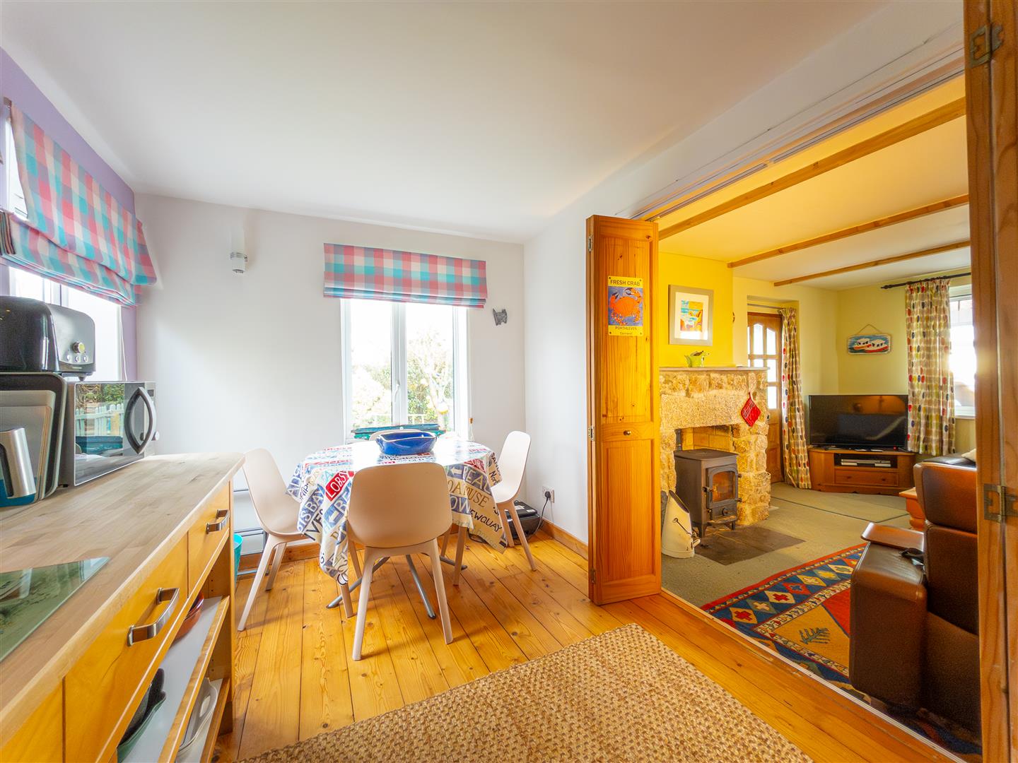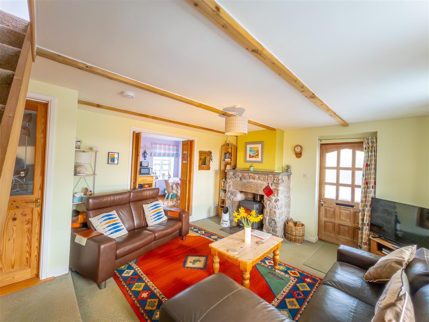 A lovely cosy room with two windows to front, radiator, log burner set in stone surround, stairs rising to the first floor, connecting door to the bedroom/dining room in the main property and concertina doors and door to