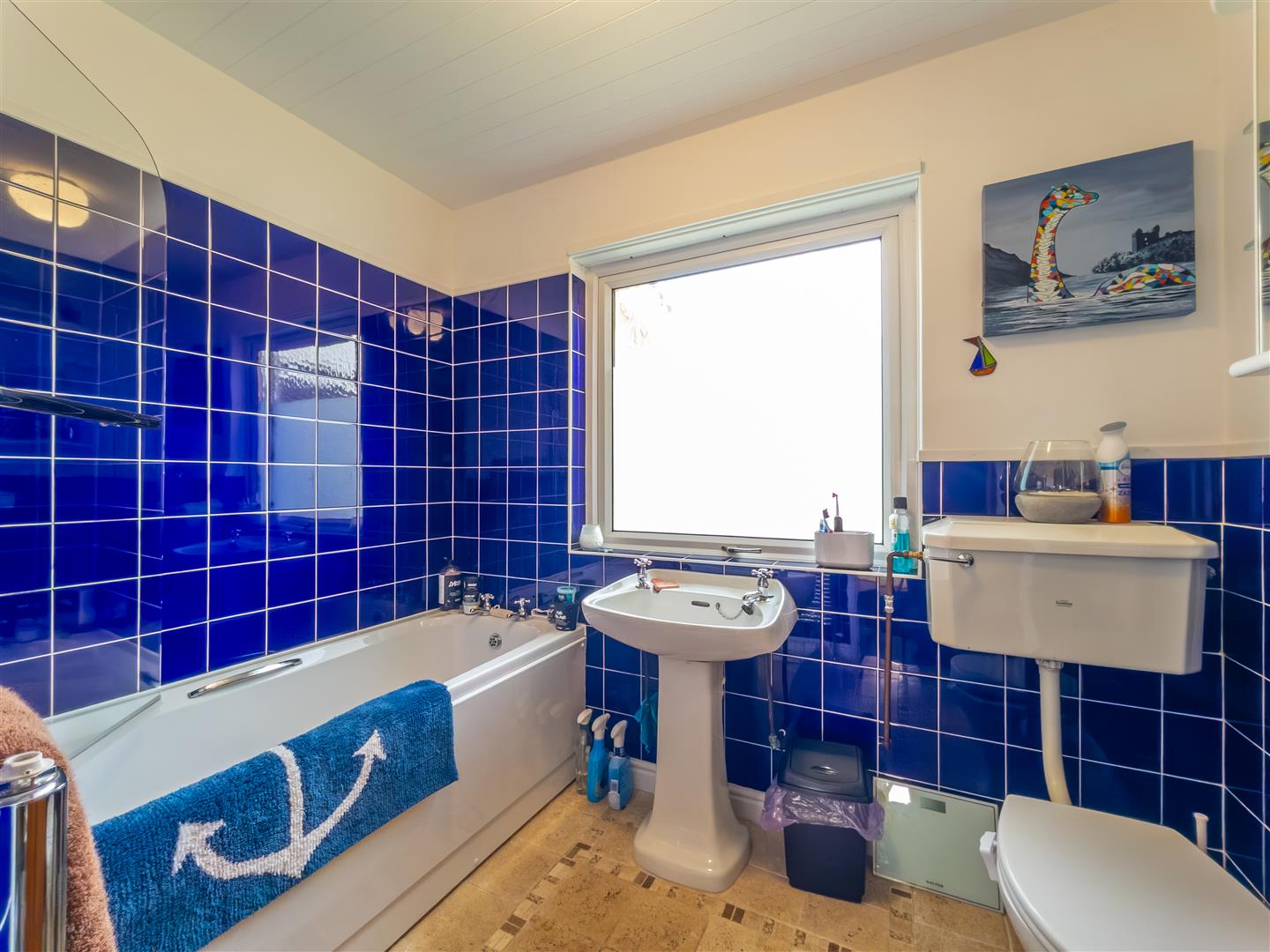 With tiled floor and suite comprising of a bath with tiled surround and Mira Go electric shower over, pedestal wash hand basin, low level W.C., obscured window to rear and chrome effect ladder style radiator.