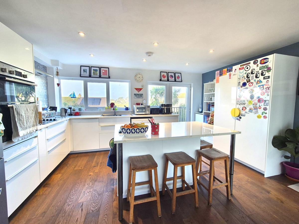 An attractive kitchen comprising working top surfaces incorporating a one and a half bowl sink unit with drainer, mixer tap over, cupboards and drawers under and a central island provides a breakfast bar with drawers under. There are built-in appliances including a double oven, hob with hood over, whilst there is space for dishwasher and a free standing fridge/freezer. Door to the outside and door to