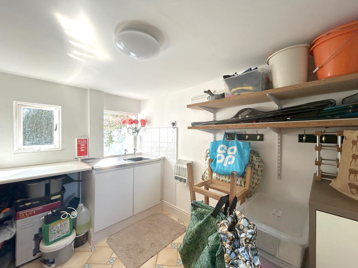 With a shelf and a window to the rear aspect, opening to the rear hallway area with ladder style chrome drying radiator and shelf, along with a useful built-in cupboard with hanging space. A door to the shower room.