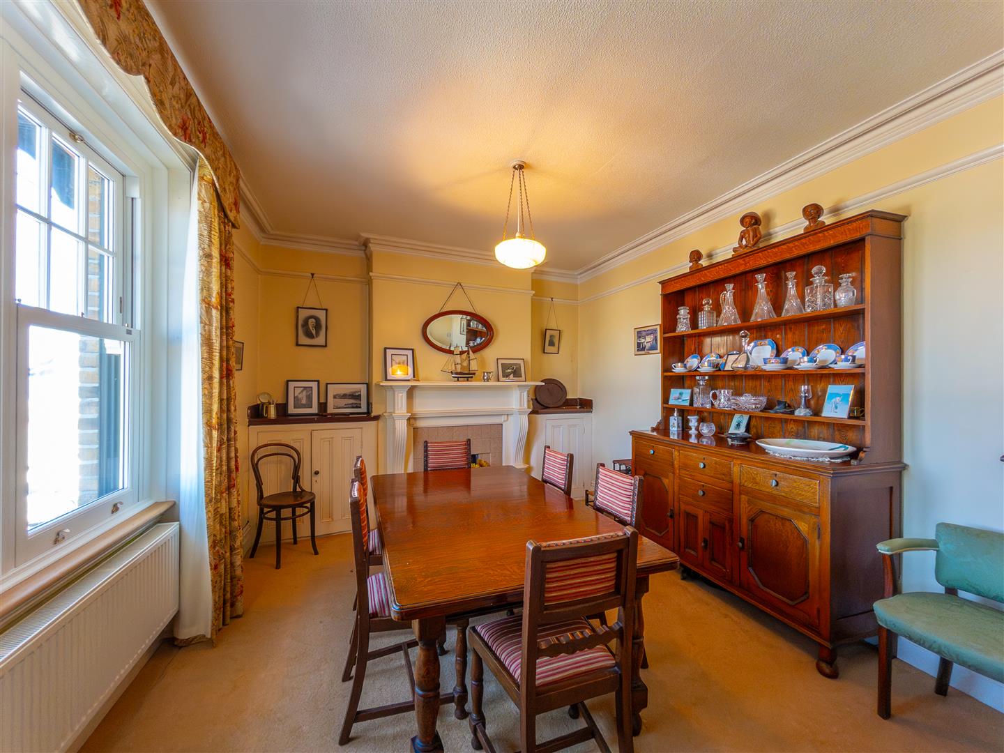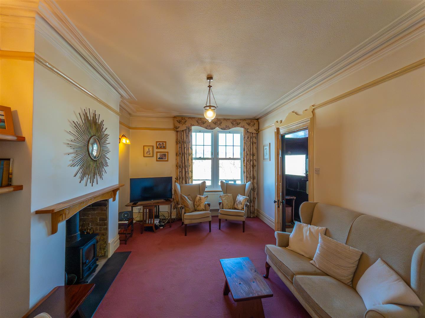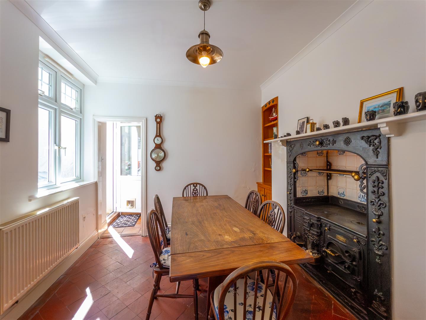 Having an impressive decorative fireplace housing a Terrell and Rogers Range (decorative only). Feature alcove shelving and cupboards to side, part glazed door to hallway, windows to rear courtyard, tiling to the floor and opening to the kitchen.