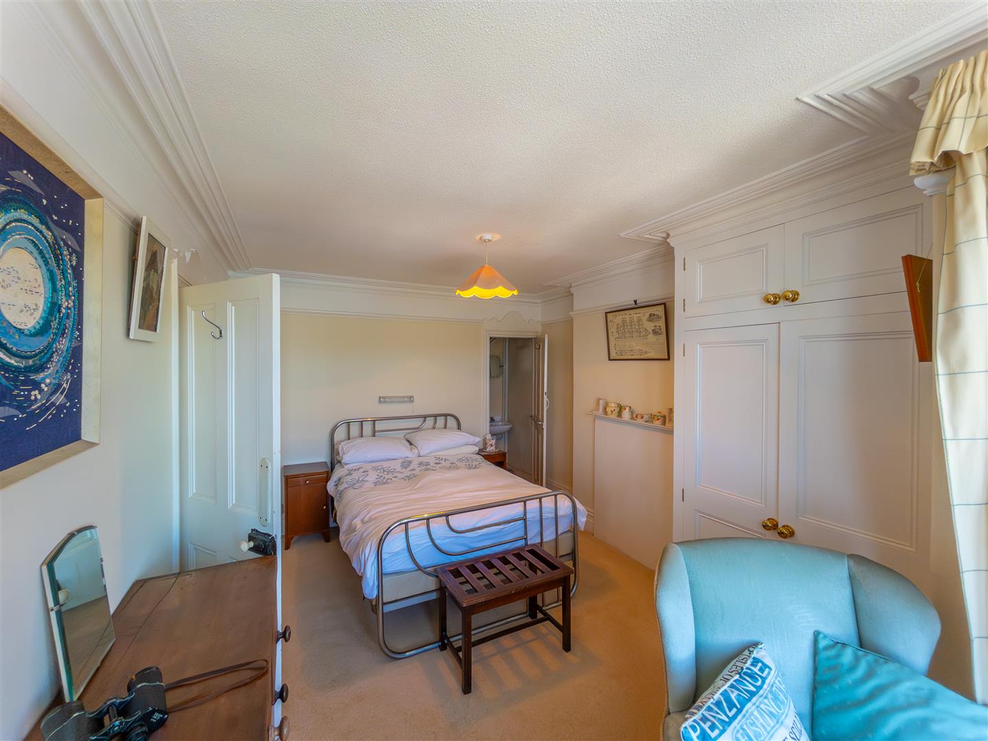 Fabulous double bedroom with bay window enjoying a magnificent elevated outlook across Coverack Harbour, beach and the sea beyond. There is a pedestal wash hand basin with splashback, shaving point/light, a fabulous decorative fireplace, built-in wardrobes suite with hanging rails and storage cupboards over and an array of sash windows.