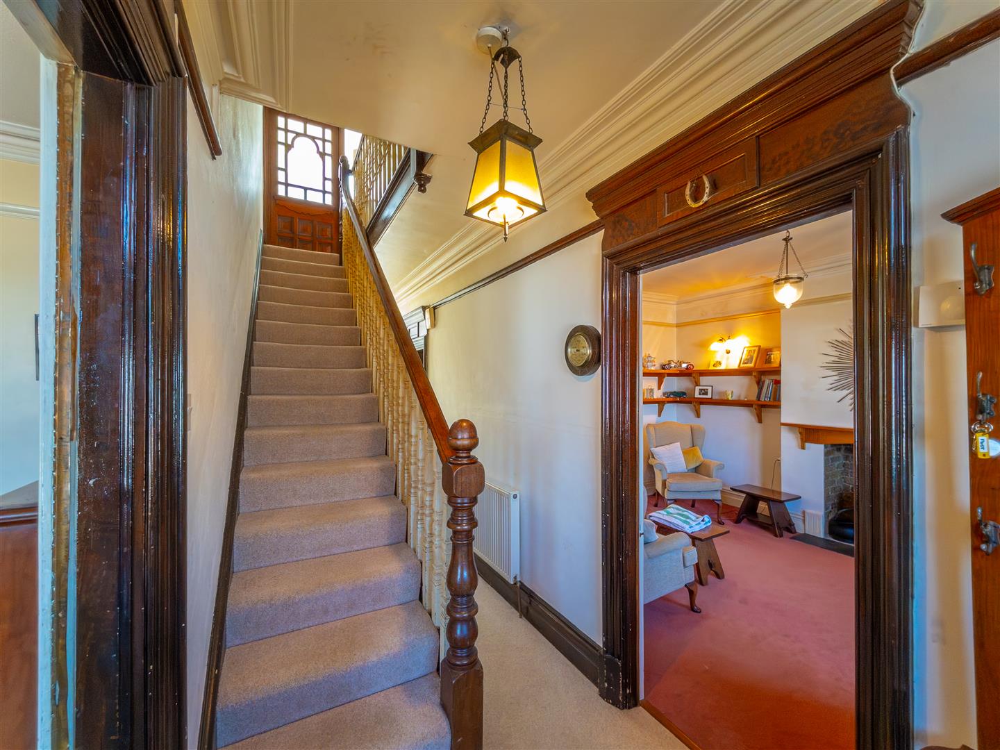 With balustrade, ornate period wood detailing, opening to staircase to second floor, opening to inner landing and doors off to cloakroom and bedrooms one, two and three.
