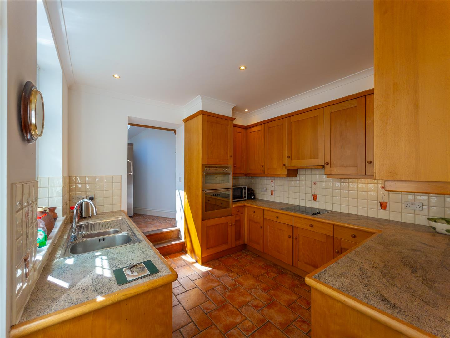 Comprising a well equipped modern fitted kitchen with working top surfaces incorporating a one and a half bowl stainless steel sink with drainer and swan's neck mixer tap and Neff electric hob with hood over. There are a pleasing range of base cupboards and drawers, including twin carousel units, complimented by wall units with display shelves. Integrated appliances include an electric oven, grill and dishwasher. There are tiled splash backs, under counter lighting, recessed spotlighting, terracotta tiling to the floor, windows and a part glazed door to the inner courtyard. Steps up to the utility area.