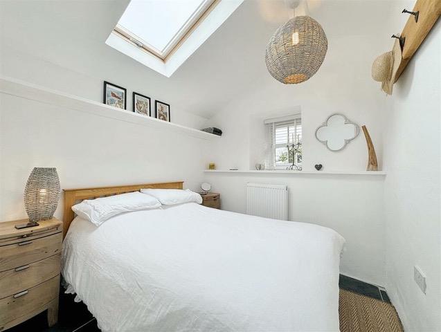 Upstairs, the master double bedroom enjoys views out towards the sea and benefits from a private en-suite shower and cloakroom, whilst there is a further double bedroom with views towards Coverack bay. The family bathroom is nicely appointed with a crisp white suite and metro tiling.