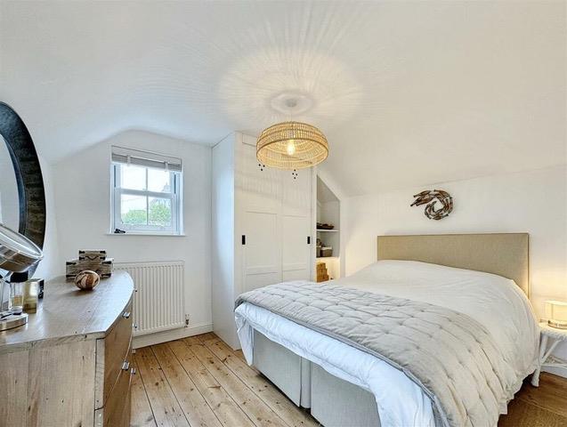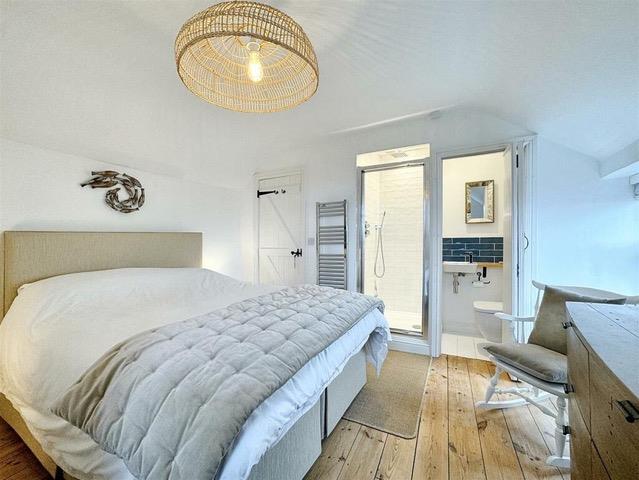 Delightful dual aspect double bedroom with exposed timber flooring, a bespoke built in wardrobe with sliding doors and hanging rails and bespoke alcove shelving. Door to built-in shower cubicle housing a thermostatic shower with drencher head, shower attachment, extractor, and white ‘metro’ style tiling. White concertina door to the cloakroom with low-level w.c with concealed cistern, mounted wash handbasin with attractive tiled splashback, a bespoke storage cupboard, white painted timber flooring. There are windows to the front and side elevations, both of which enjoy sea views beyond neighbouring properties.