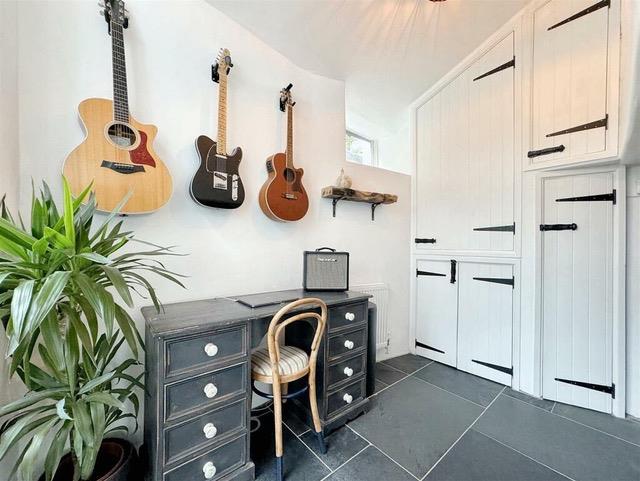 A versatile and highly practical space, which could easily be utilised as an office for those seeking to work from home. There are a number of useful latched cupboards which provide useful storage and house a washing machine, Worcester emersion cylinder and an electric Heatrae Sadia boiler. There is a coat hanging rail with storage shelf over, a part vaulted ceiling, slate flooring and bespoke glazed feature doors with transom over to rear.