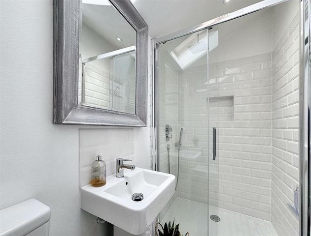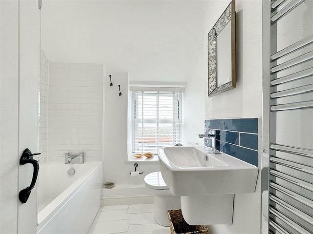 Delightfully appointed with a low-level w.c, wall mounted wash handbasin with mixer tap over and a white panelled bath with shower screen and housing a thermostatic shower. There is white ‘metro style’ tiling, recessed spotlighting, an extractor, a chrome ladder style towel rail, white painted timber flooring and a window to the front aspect with sea glimpses beyond neighbouring properties.