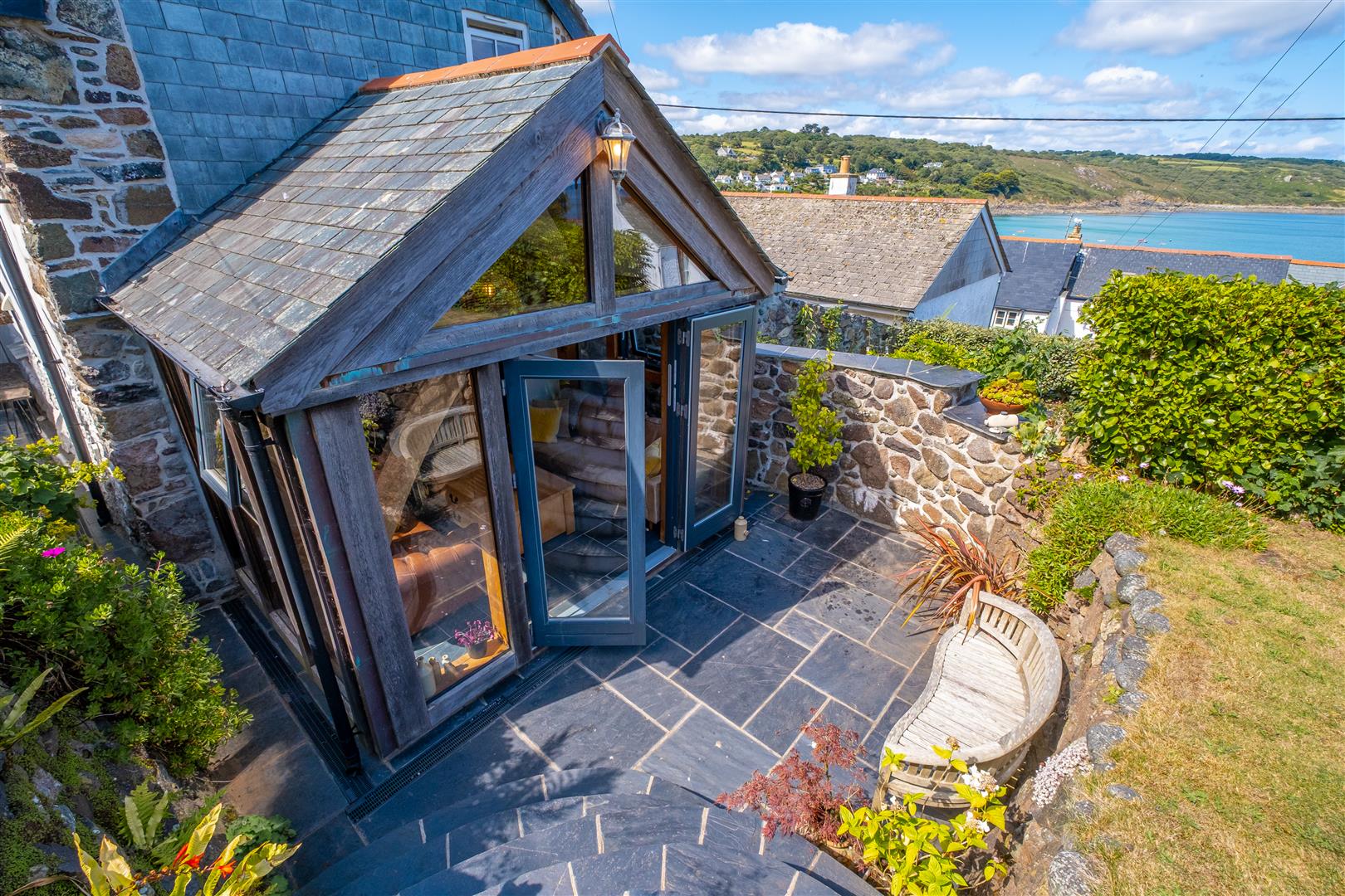 The beautiful tiered gardens to the rear are nicely landscaped and laid largely to lawn with fabulous elevated views across the village to Coverack bay and beyond. Steps from the lovely sheltered sun room patio area lead up to a useful kayak and beach store, beyond which is the rear gate which leads to the public footpath. Enclosed by mature hedging and a Cornish stone wall, the garden enjoys a sunny outlook with further elevated patio and decked areas, seeming to offer the perfect place to enjoy al fresco dining and the enviable coastal views on offer.
