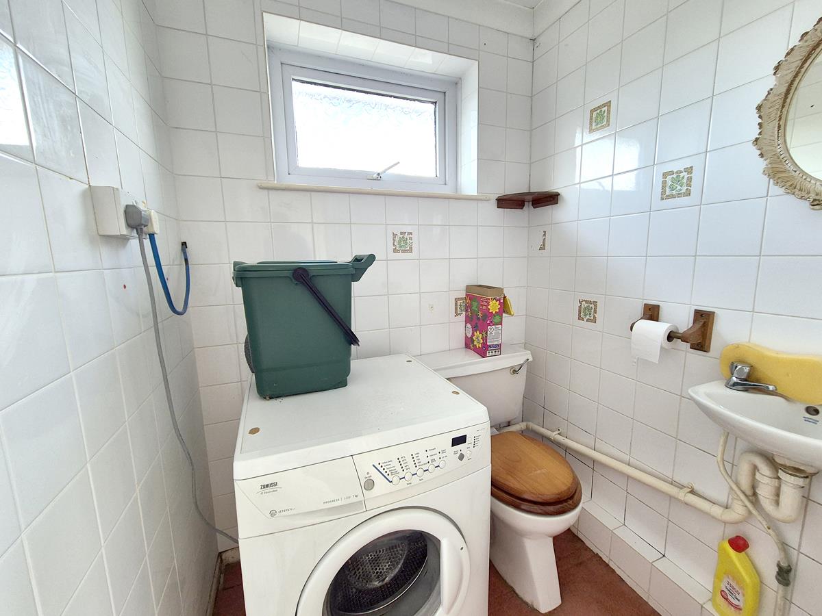 Comprising a close coupled w.c., wall mounted wash basin and space for a washing machine. There are tiled walls and a frosted window to the side.