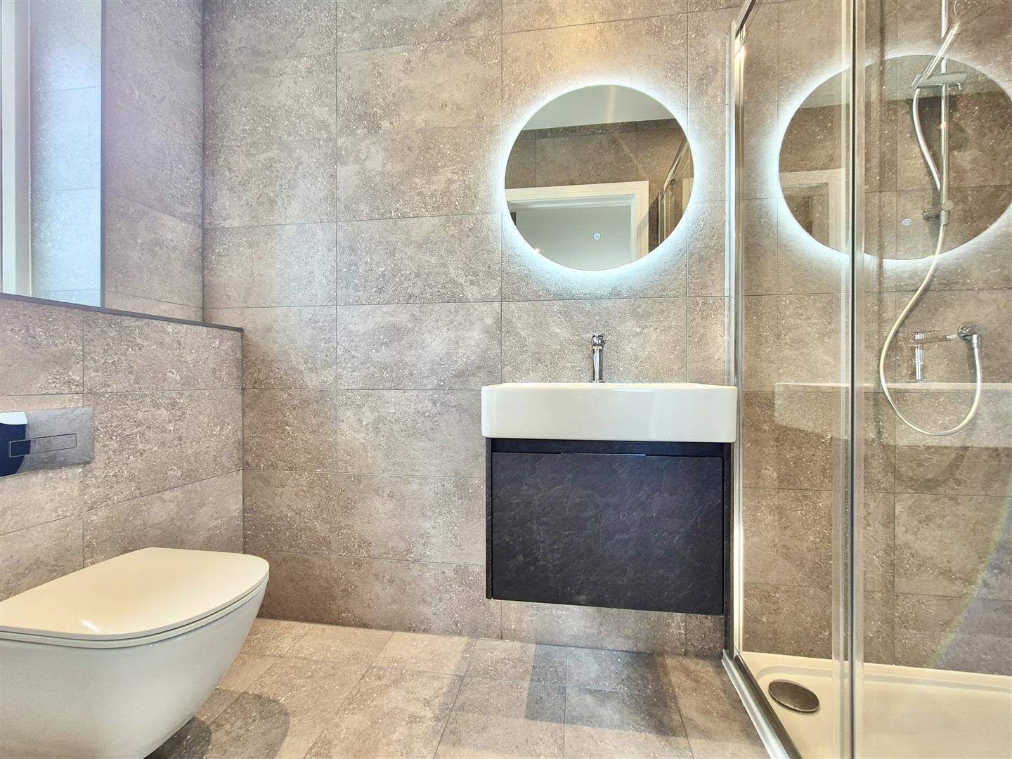 Being tiled to floor and walls with attractive matt grey large form tiles with concealed cistern low level W.C., wall mounted wash hand basin in vanity unit with mixer tap, wall mounted LED lit circular mirror above. Double shower cubicle with sliding door with mixer shower, drench head and hand held wand.