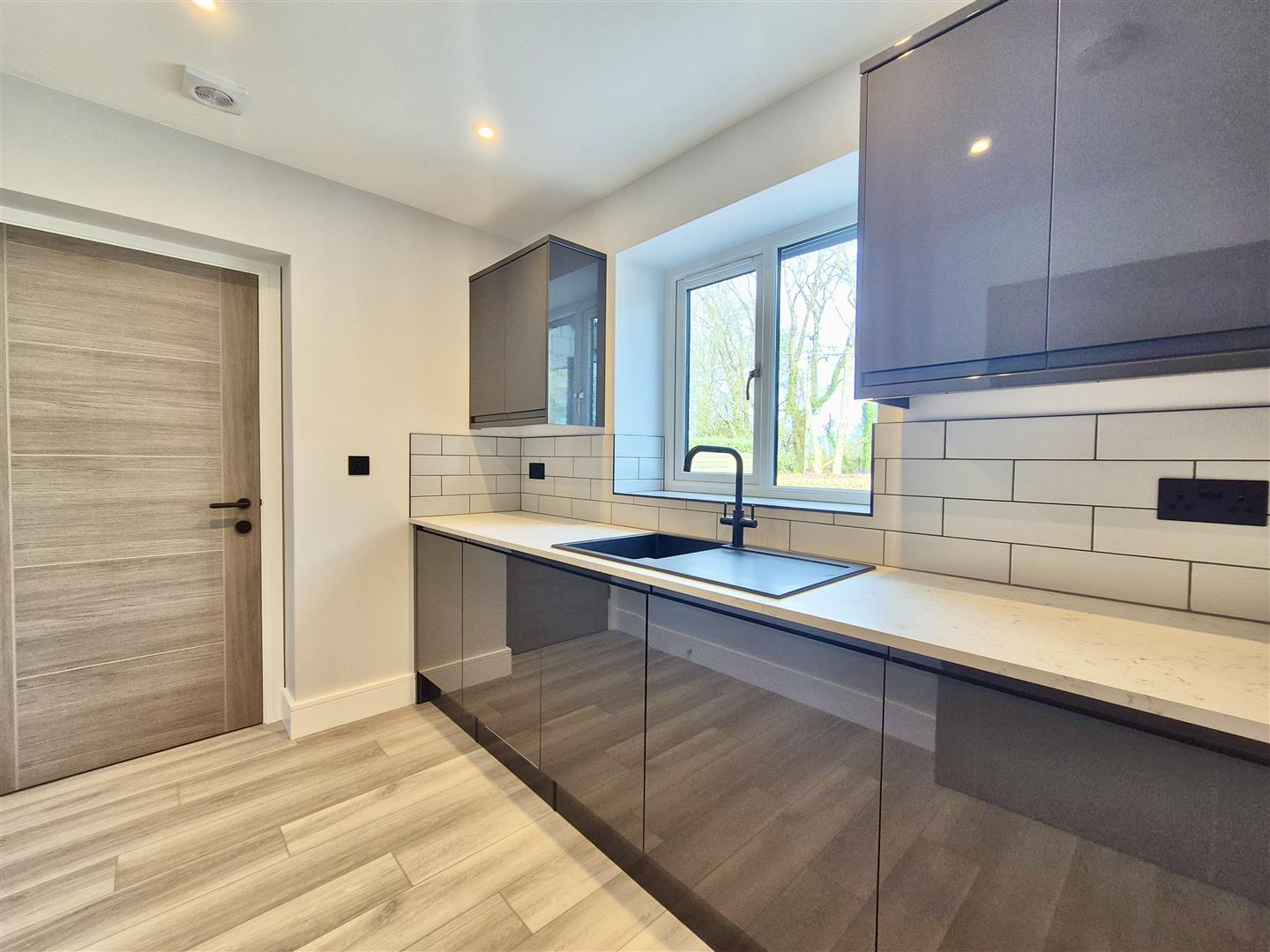 With practical hard flooring, fitted with grey gloss base and wall units with integrated washing machine and tumble dryer both with child safe magnetic closure doors, work surfaces over with composite sink and drainer with mixer tap and stylish tiled splashback, black sockets and light switches, window to front and door to garage.