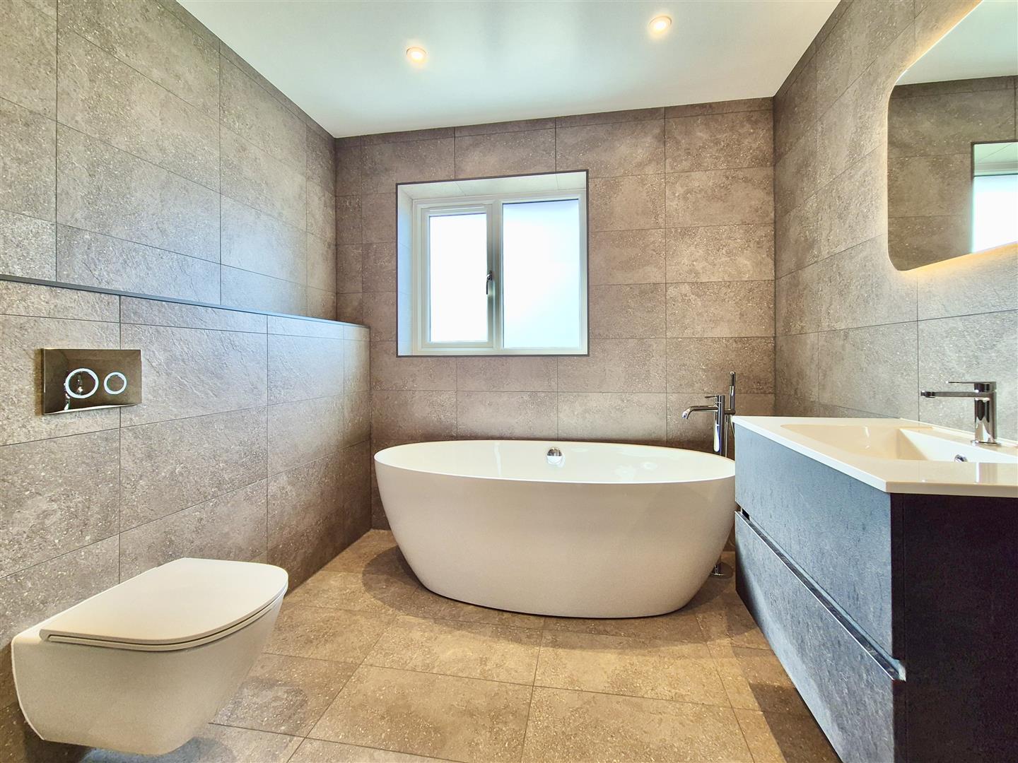 Being tiled to floor and walls in attractive matt grey large form tiles with feature free standing bath with floor mounted mixer tap and hand held wand, concealed cistern, low level W.C., double shower cubicle with sliding door housing a mixer shower with drench head and hand held wand, wash hand basin with mixer tap in vanity unit offering useful storage drawers below with wall mounted LED lit mirror over. Obscured window to rear and extractor.