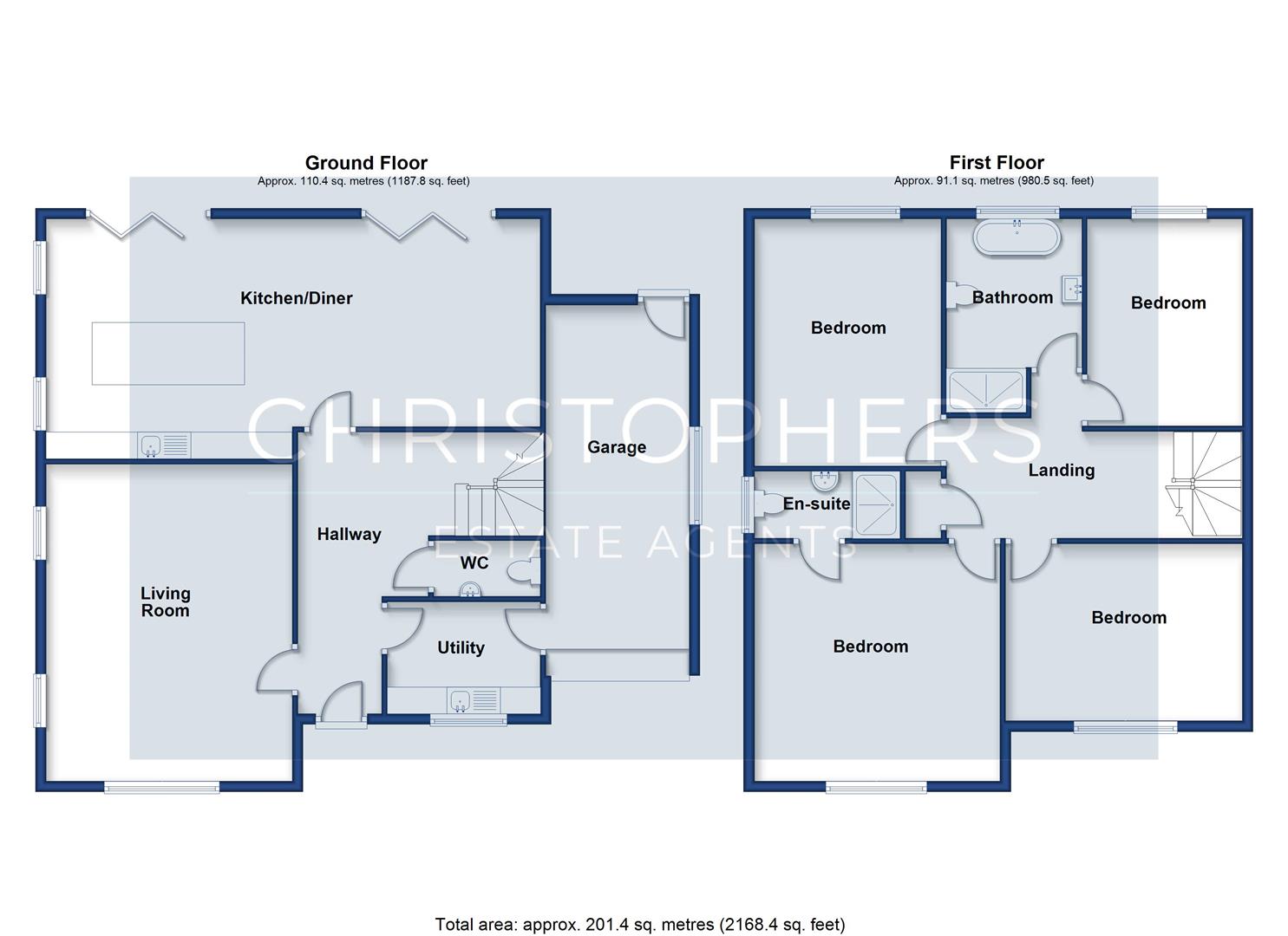Upstairs the spacious landing benefits from a useful storage cupboard with power and light. The landing also provides access to all four bedrooms and the family bathroom. Each of the bedrooms is a comfortable double, with the master bedroom enjoying the added luxury of a beautifully appointed en suite shower room.