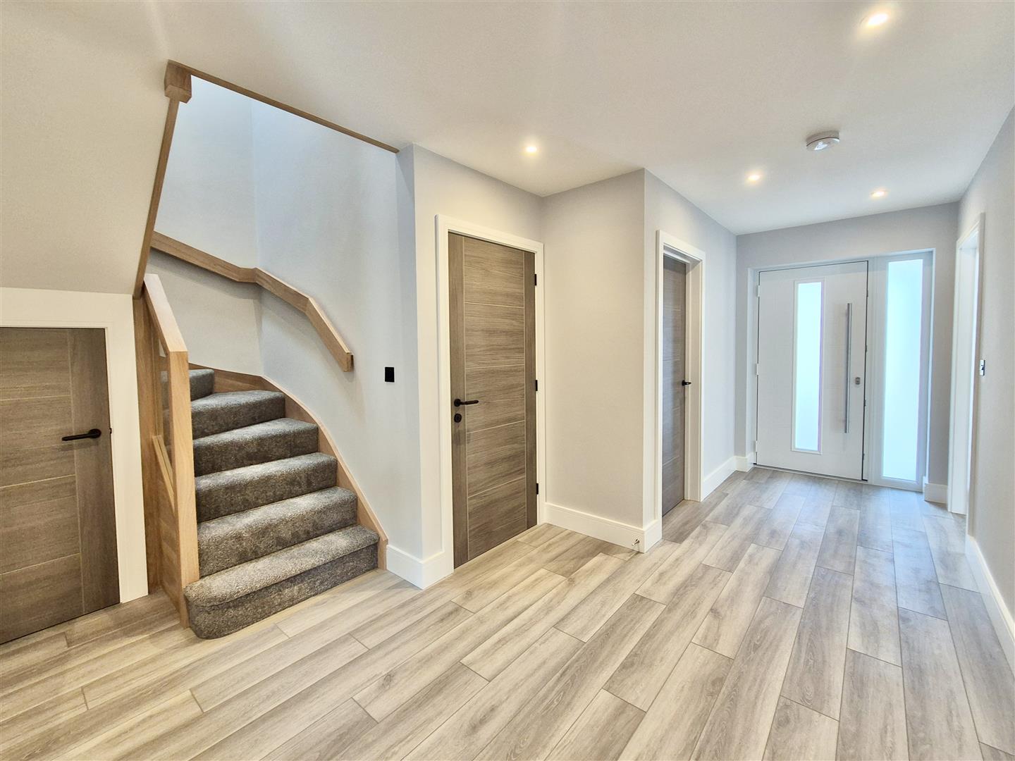 From the moment you arrive the property makes an immediate impression. Throughout a sophisticated palette of soft greys and crisp whites creates a calm and elegant atmosphere, complemented by stylish modern accents including matt black door furniture, sockets and thresholds. The ground floor benefits from an air source heat pump, underfloor heating and is laid with attractive hard flooring in contemporary grey tones, while the staircase and first floor enjoy luxurious grey carpeting which enhances the sense of comfort.