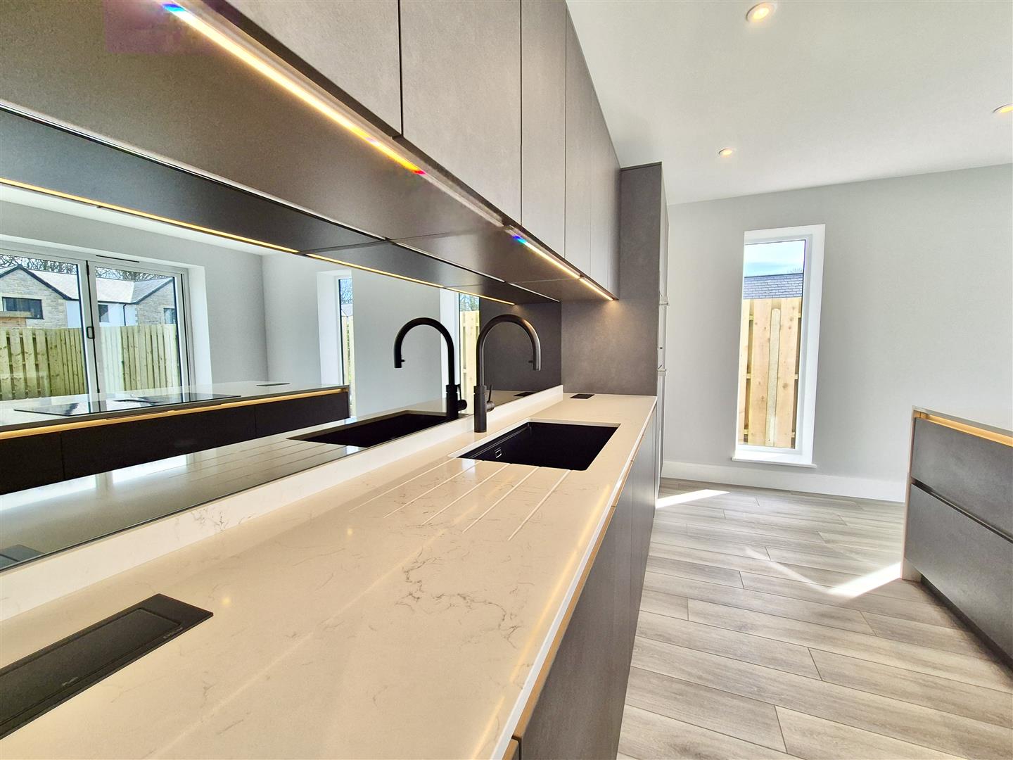 A truly impressive space being dual aspect with two vertical windows to the side and two sets of bifold doors to the rear offering access to the deck and rear garden. Fitted with a T.V point and finished with black sockets and light switches The absolute heart of the home whether you are a busy family or a couple that love to entertain this space is wonderfully light and versatile.