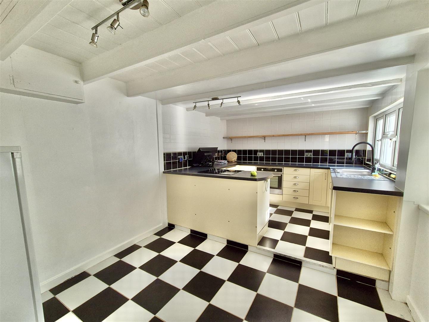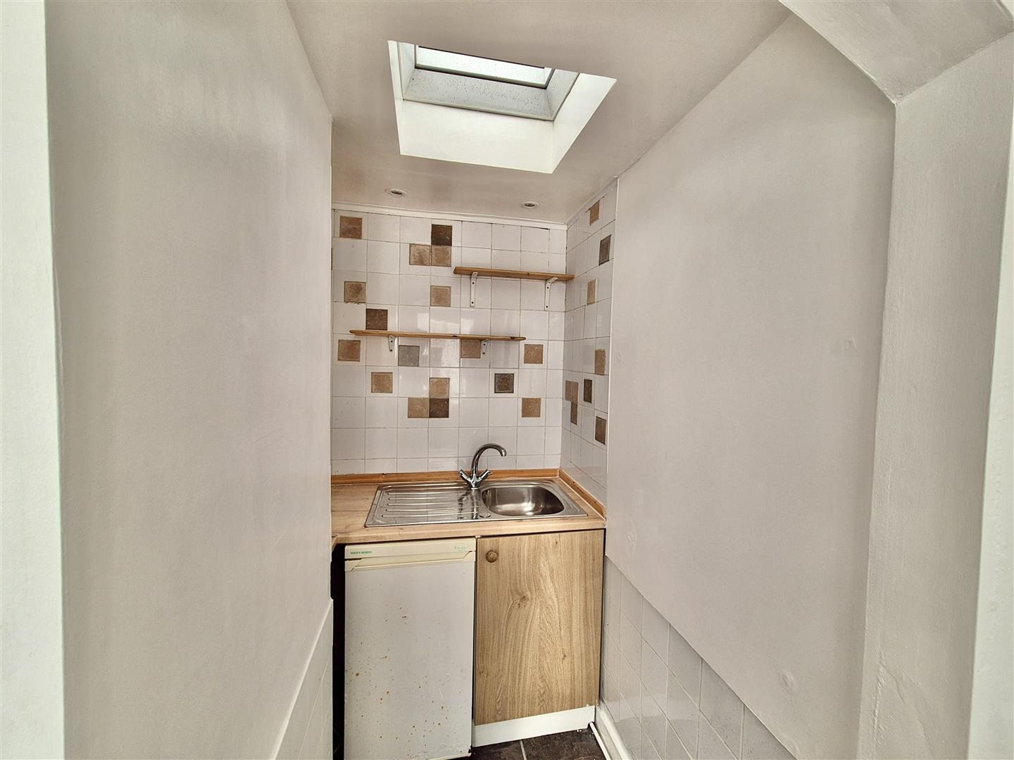 Comprising a working top surface incorporating a sink unit with drainer and mixer tap over, cupboards and drawers under. There is space for a dishwasher and this area has partially tiled walls and an opaque skylight.