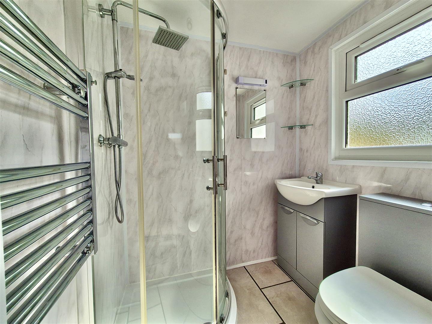 An en suite shower room comprising a shower cubicle, close coupled W.C. and a washbasin with mixer tap over and cupboards under. There is a heated towel rail and a frosted window to the side.