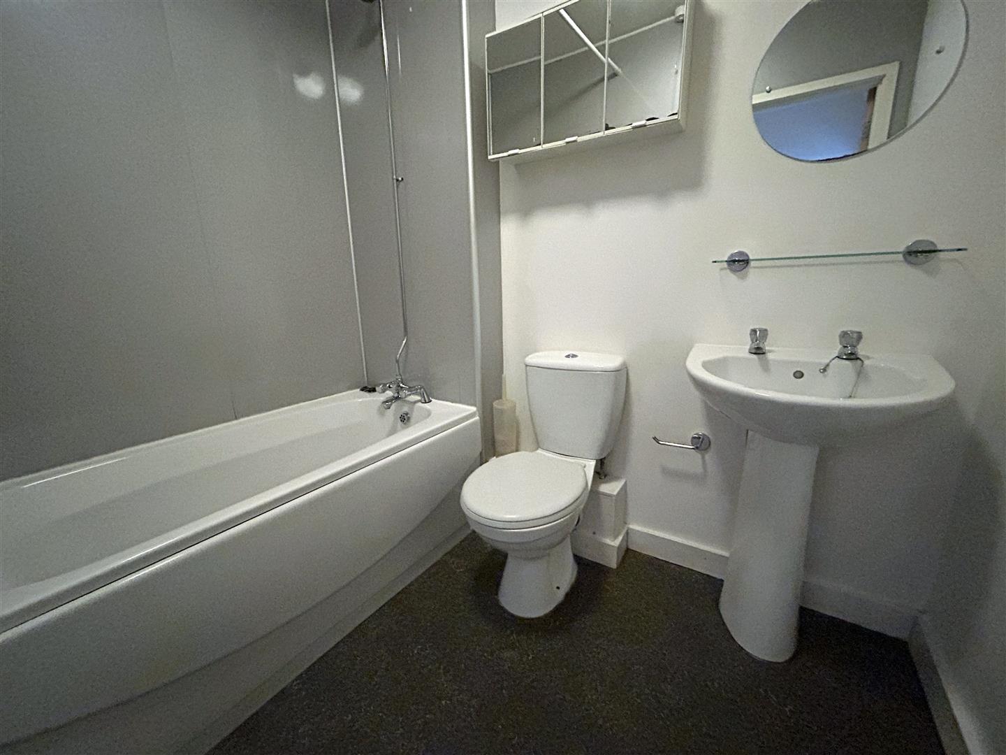 Comprising white suite with panelled bath, mixer shower over and easy clean splashback, close coupled W.C., wash hand basin with glass shelf and shaver socket with light over, chrome towel drying radiator, vinyl flooring and extractor.