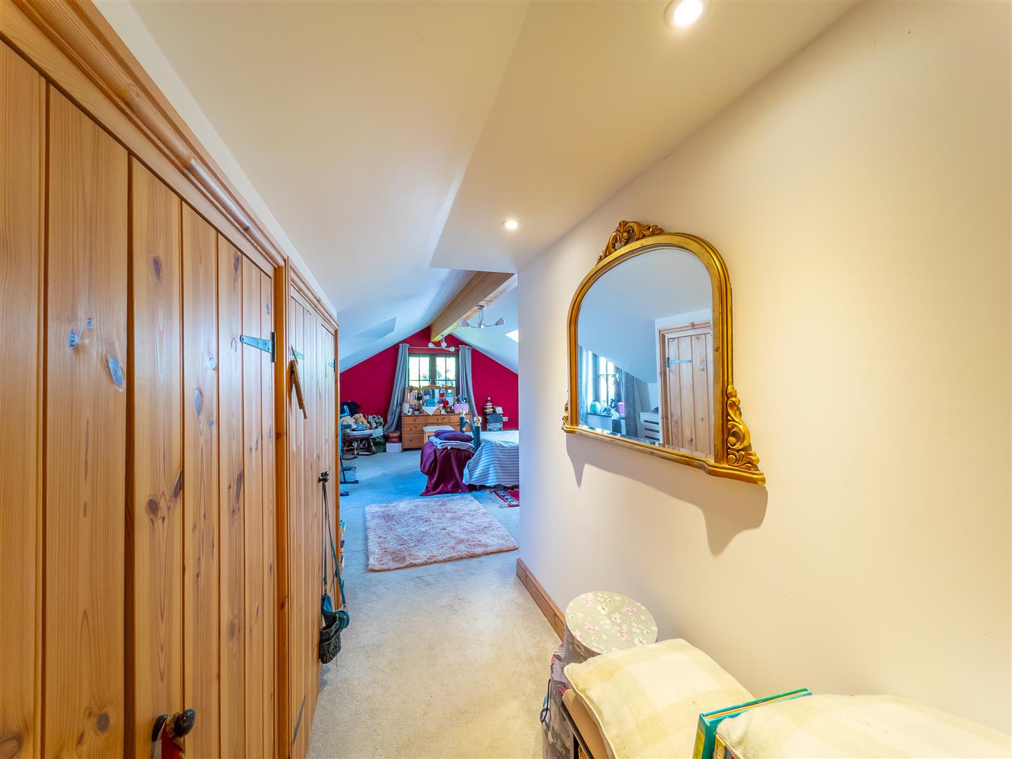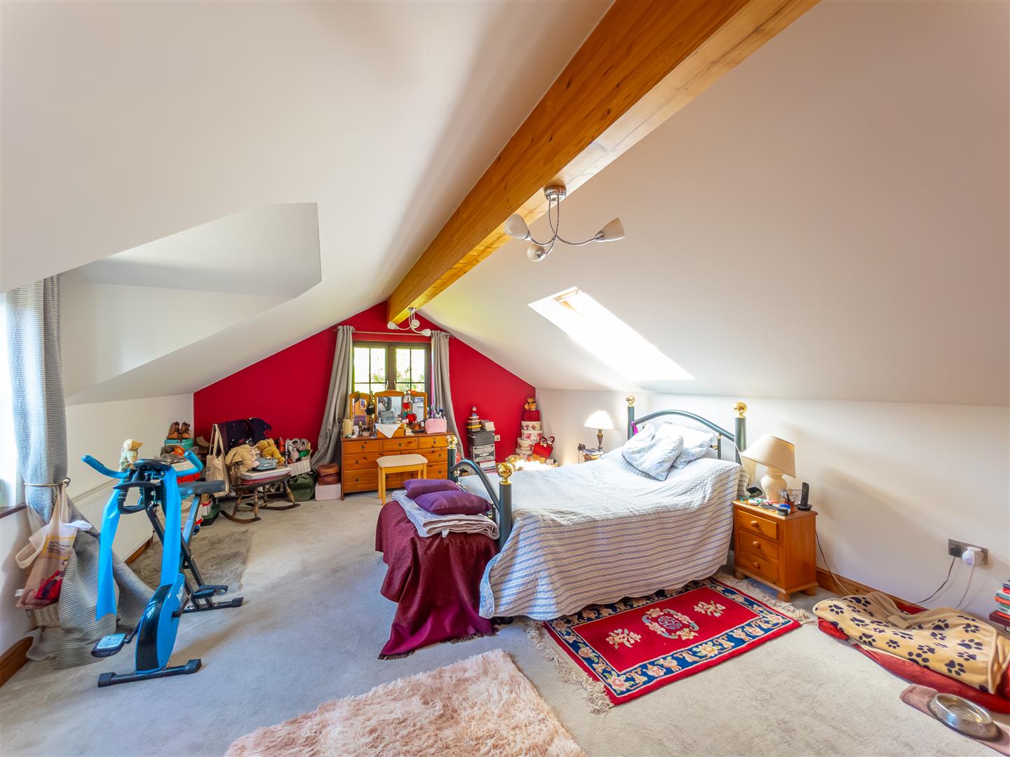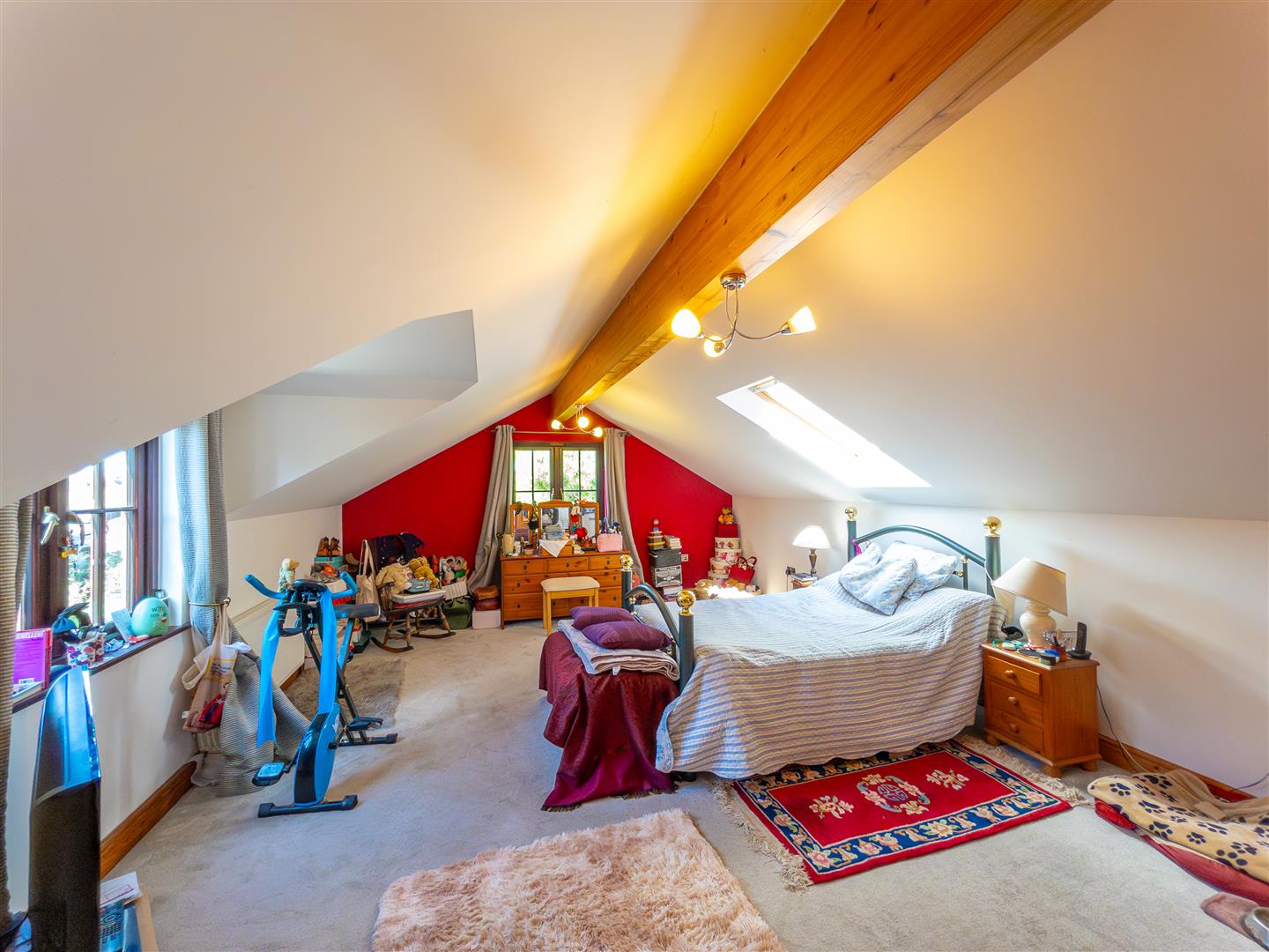 A very spacious comfortable triple aspect double bedroom suite with skylight, attractive light fittings and exposed timber beam. The dressing room area plays host to bespoke built in wardrobes with hanging rails, whilst there are some areas of restricted headroom. The room has an elevated outlook towards the front driveway, gardens and open countryside beyond.