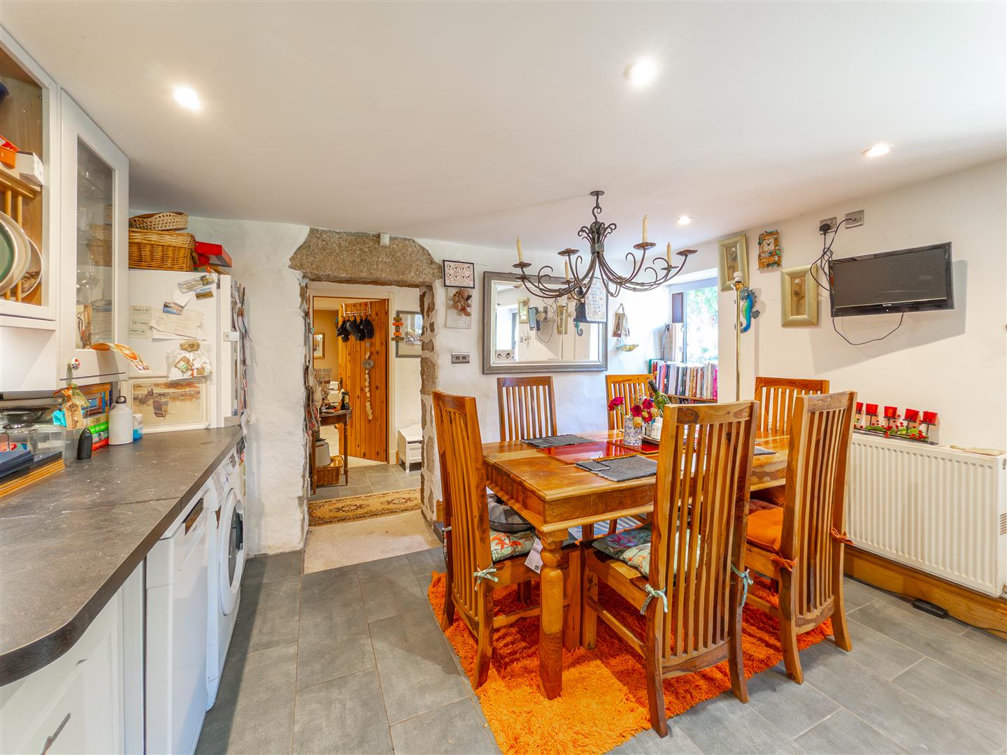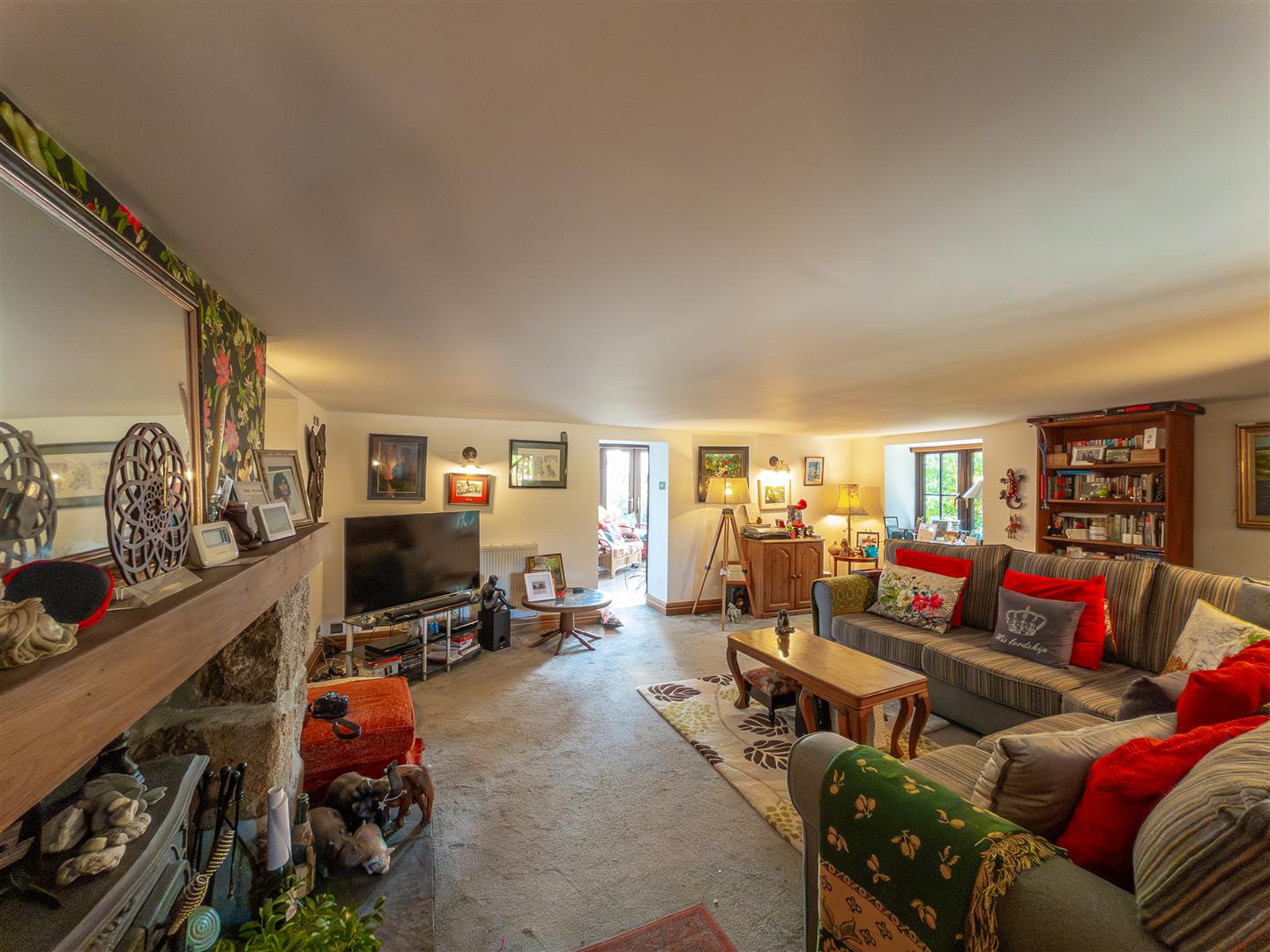 A well proportioned open plan triple aspect room with an impressive local stone fireplace with slate hearth and timber mantle, housing a woodburning stove and providing a lovely focal point for the room. There are windows to the front and side elevations, a recessed storage area, an opening to the staircase to the first floor and a stable door to the conservatory.