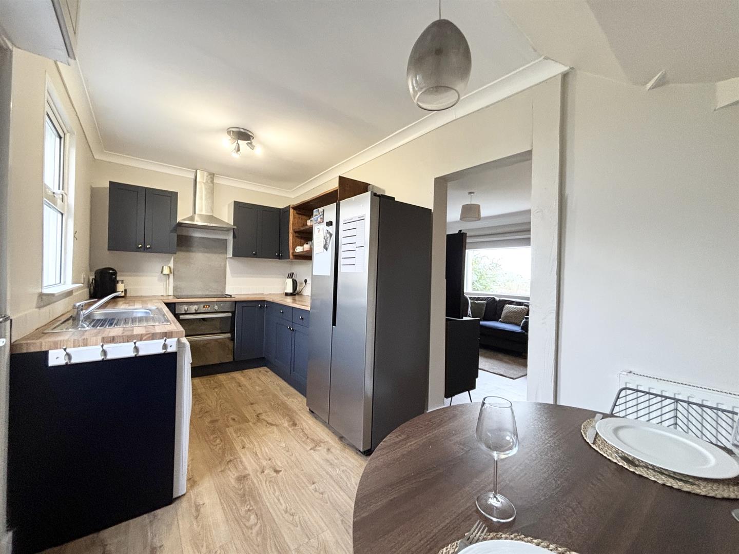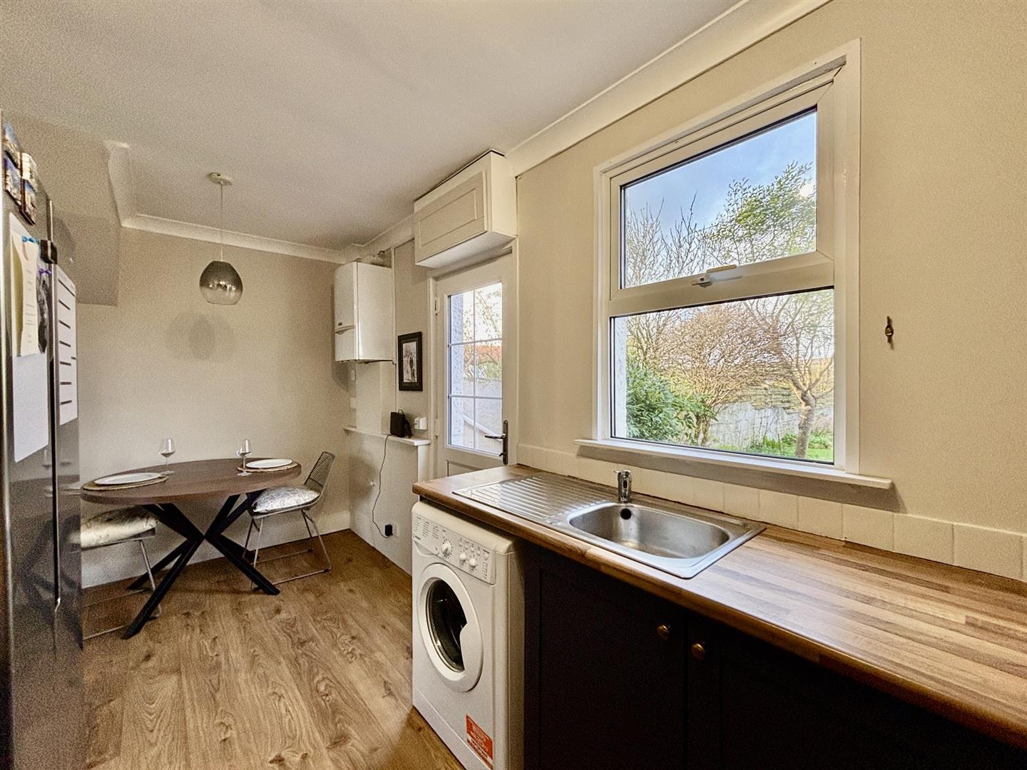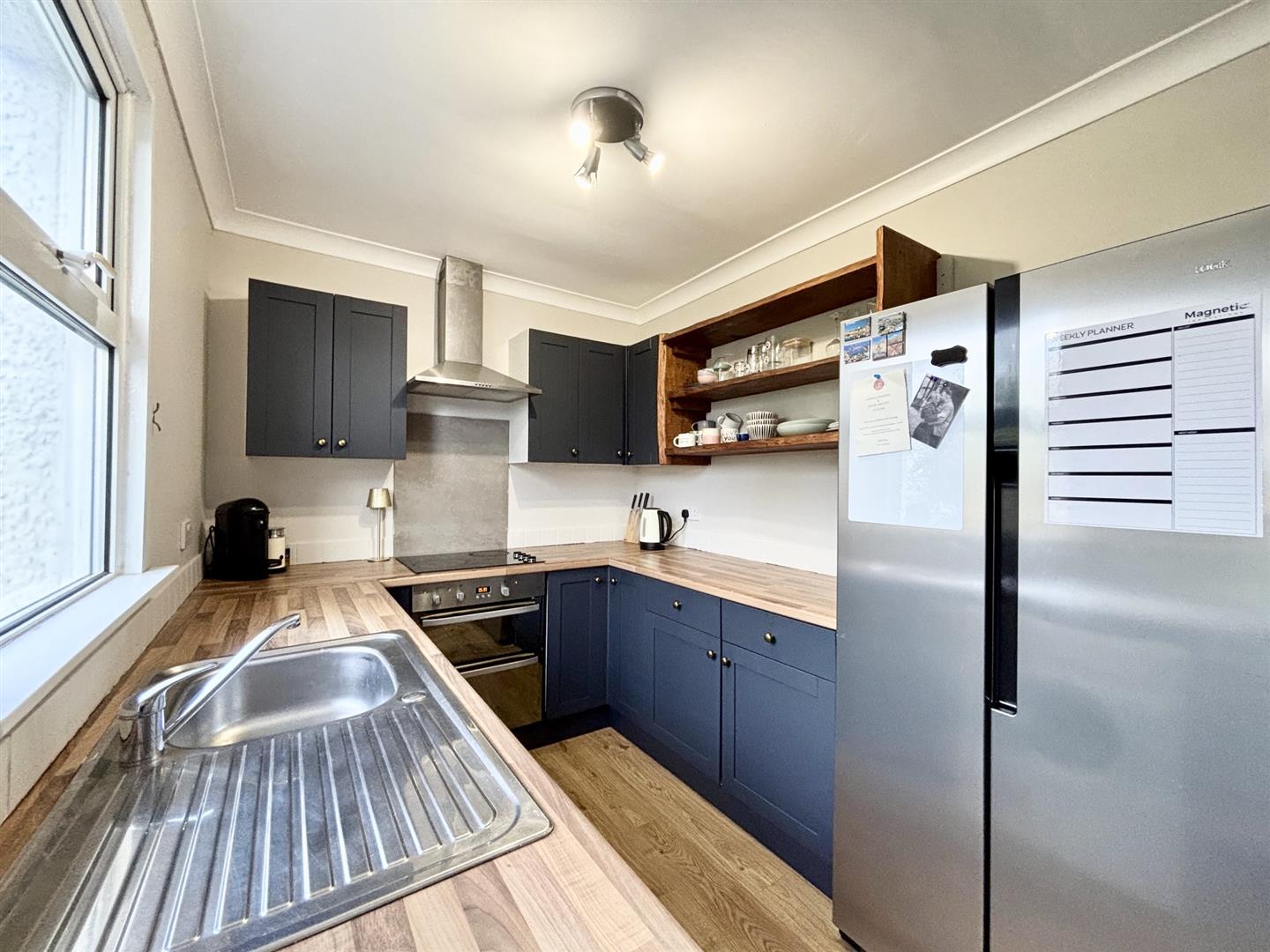 Fitted with a stylish navy blue base and wall units with work surfaces over with brass effect knobs and feature open display shelving, electric double oven with hob over and stainless steel filter and light above, stainless steel sink drainer, space and plumbing for washing machine and space and point for American style fridge/freezer. Breakfast area with space for table and chairs, radiator, wall mounted Vaillant wall mounted combi boiler and door to garden.