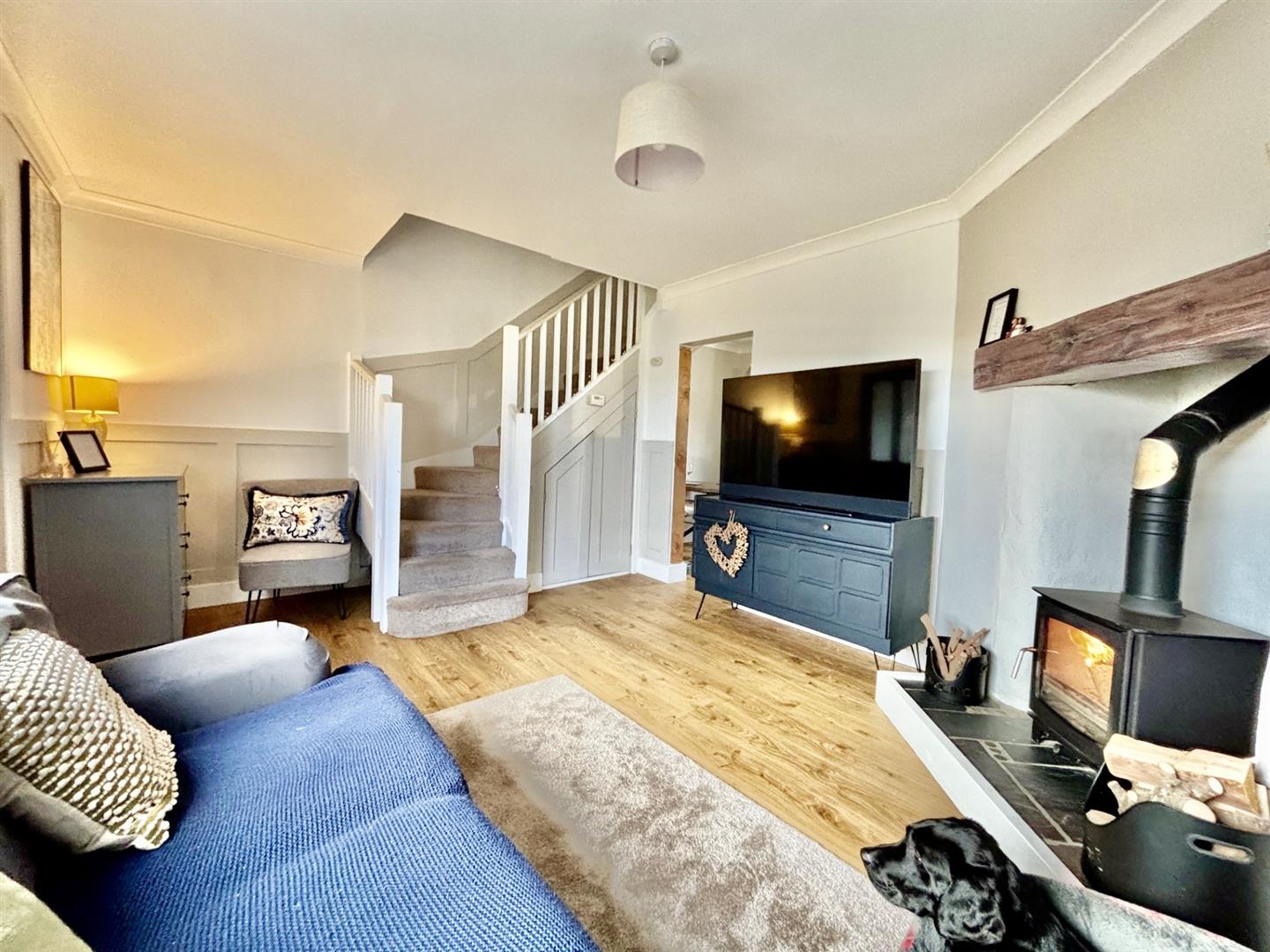 A lovely cosy and stylish room with window to front, radiator and log burner, turning staircase to first floor with understairs storage and opening to