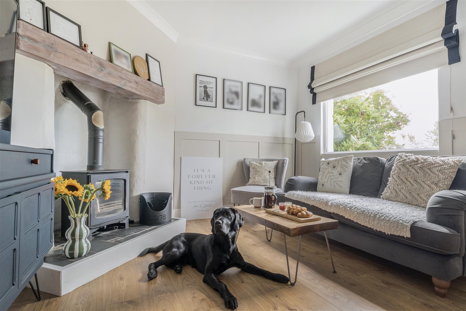 The sitting room is wonderfully cosy, centred around a charming log burner that creates a warm and welcoming heart to the home. To the rear, the stylish kitchen/breakfast room features elegant navy cabinetry, open display shelving and a thoughtfully designed layout with space to both cook and dine. A door leads directly out to the rear garden, which is a generous size – ideal for outdoor dining, children, pets or simply enjoying the peaceful surroundings.