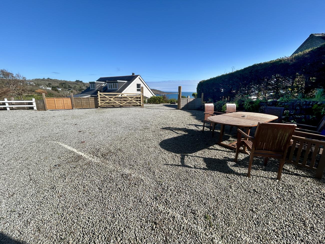 The beautifully mature gardens cradle the property, comprising a hard landscaped seating area at the front, enjoying a view to the sea. To the side and the rear there is an impressive stone wall and hedging which encloses the garden, offering good degrees of privacy. A lawned area with trees and shrubs at its border, raised beds housing many mature trees and shrubs. Steps rise to a further orchard area planted with a number of fruit trees and from many points within the garden sea and country views can be enjoyed.