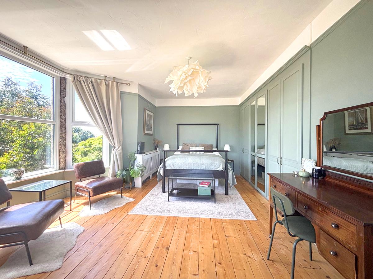 A fabulous dual aspect master bedroom offering a wonderful haven in which to retreat and relax after a busy day. With exposed wood flooring, a stunning bay window to the front with exposed granite quoins overlooking the garden and a further window to the side. Useful built-in storage comprising three double wardrobes and a radiator.