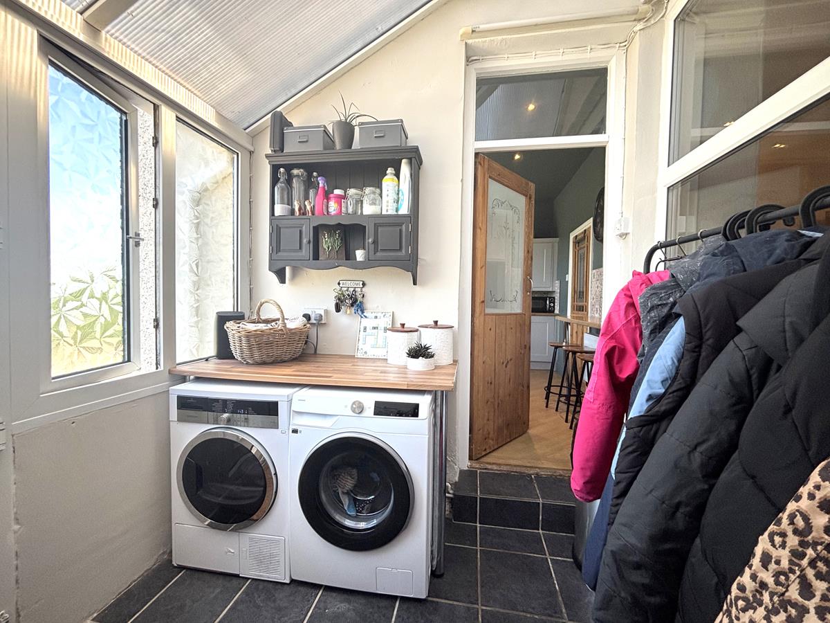 A practical room, acting as a utility room/boot room, with tiled floor, space and plumbing for a washing machine and a space and point for a condenser tumble drier with worksurface over. An external door to the rear, window to the rear and a door to the cloakroom.